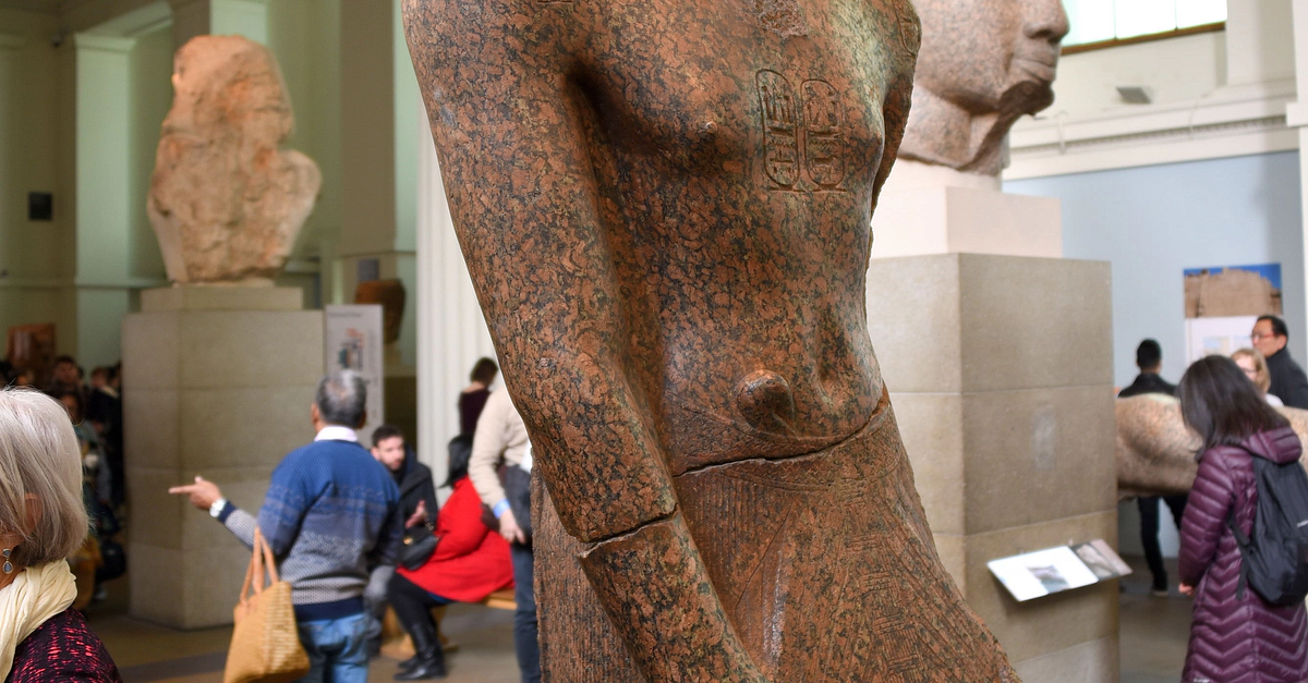 The King wears the white crown of Upper Egypt, with a protective cobra emblem, representing the goddess Wadjyt. A long flaring beard has broken away. The hands are in a position of devotion. For stylistic reasons, the identity of this king seems certain, but his name on the belt was erased, when the statue was usurped. King Ramesses II put cartouches with his names (both on the belt and shoulders) and his son, Merenptah, added a pair on the chest. 18th Dynasty, reign of Thutmose III, circa 1479-1425 BCE. From the temple of Amun-ra at Thebes, Karnak, Egypt. (The British Museum, London).