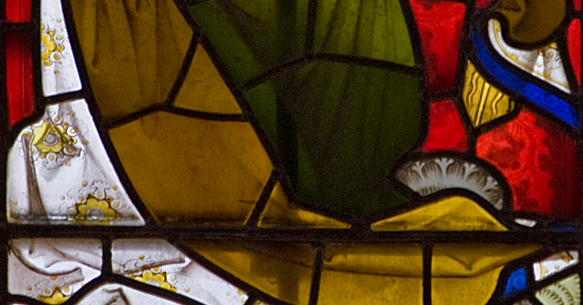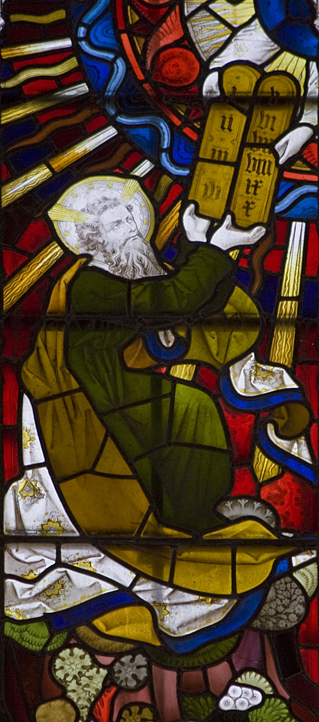 Detail from the west window of Bath Abbey showing Moses receiving the tablets of the Commandments from the hand of God.
