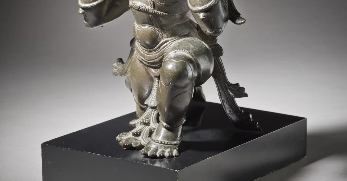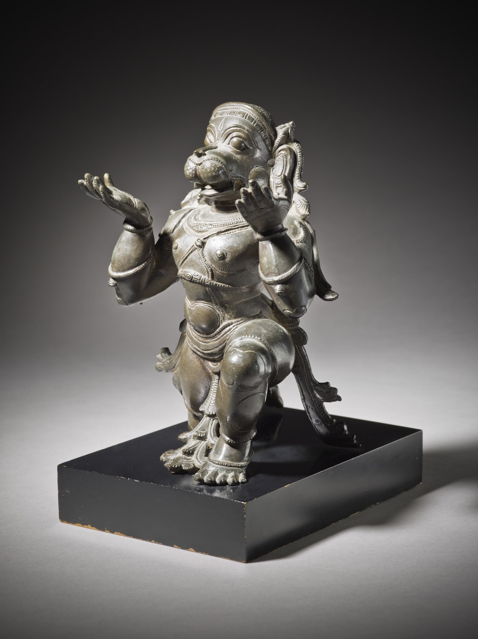 A copper alloy statue of Hanuman, the magically-gifted monkey who was the ally of Rama in Hinduism. From Tamil Nadu, India, c. 1600 CE. (Los Angeles County Museum of Art)