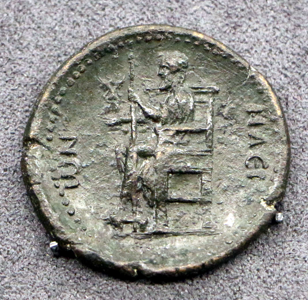 A coin from the reign of Hadrian depicting the staute of Zeus at Olympia, on of the Seven Wonders of the World. 117-138 CE. (National Archaeological Museum, Florence)