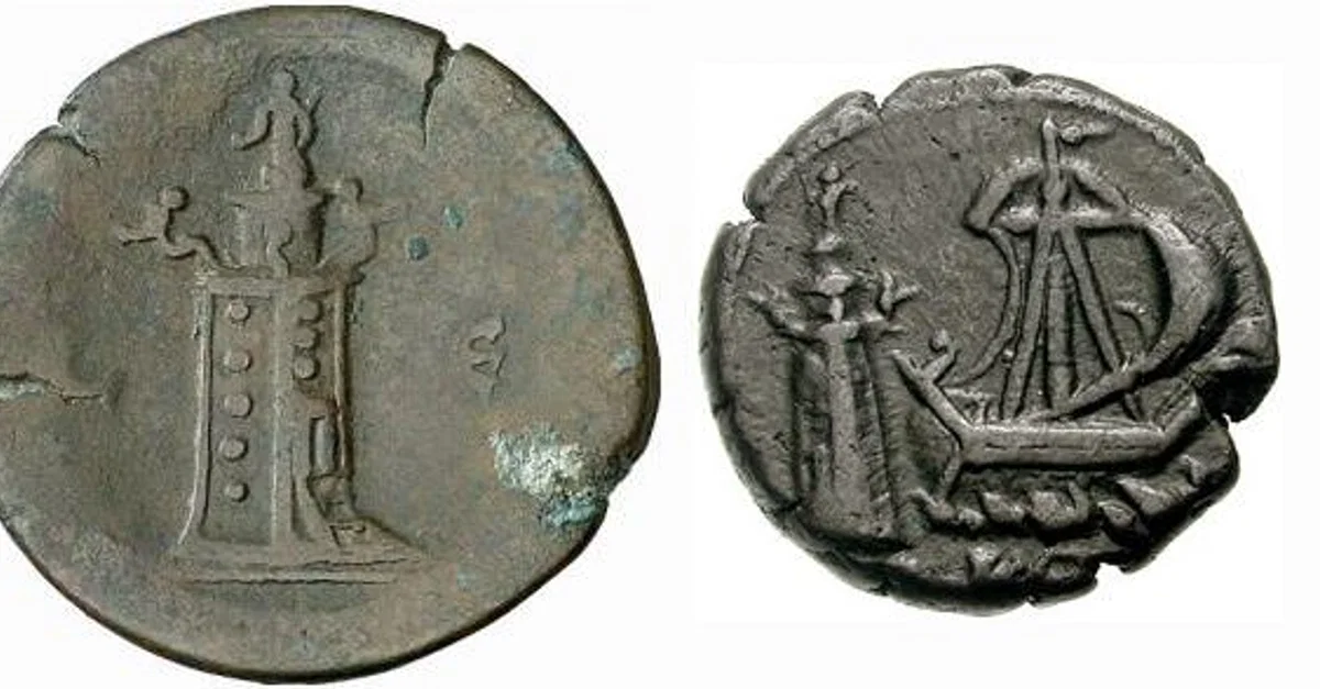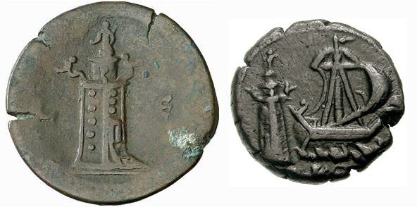 Two coins depicting the Lighthouse of Alexandria, one of the Seven Wonders of the World. Alexandrian mint, 2nd century CE.