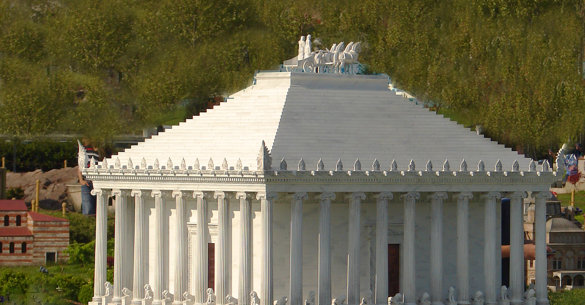 A modern scale model of what the 4th century BCE Mausoleum at Halicarnassus may have looked like, one of the Seven Wonders of the world. (Miniatuk, Istanbul)