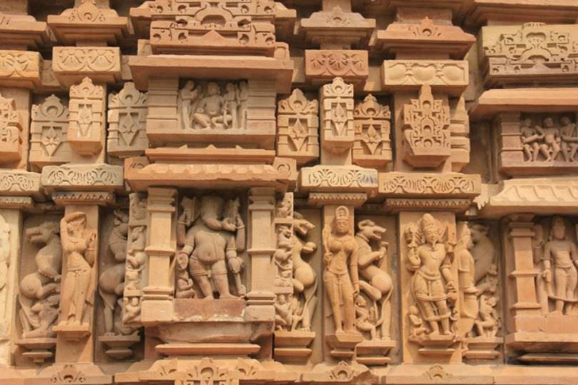 From a wall of one of the temples at Khajuraho. The bottom half has gods such as Ganesha and Agni while the top half has snapshots of human life. Khajuraho, Madhya Pradesh, India, 11th CE