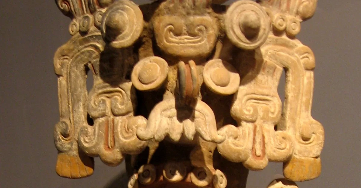 An incense burner of a deity with a headdress of the rain god Tlaloc. Produced by the Tarascan civilization which flourished in western Mexico between 1350 CE and 1522 CE. (Snite Museum of Art, Indiana)