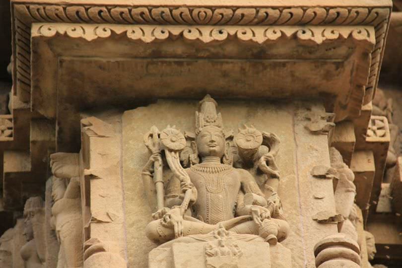 Surya, the Sun God. He holds lotuses, a mace, and a water pot. Not visible clearly in this picture is a also a time wheel that's in one of his bottom left hands. He wears a breastplate. His charioteer, Aruna, sits at the front. Khajuraho, Madhya Pradesh, India, 11th CE.