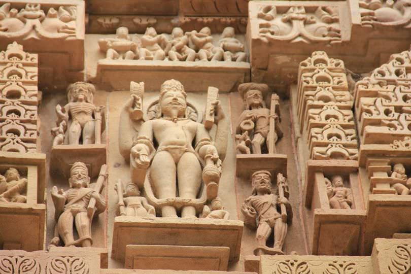 Agni, the fire god. He holds a sacrificial altar, the Vedas, and a water pot, and is surrounded by four smaller fires, their skeletal forms showing the effect they have on humans. Khajuraho, Madhya Pradesh, India, 11th CE.