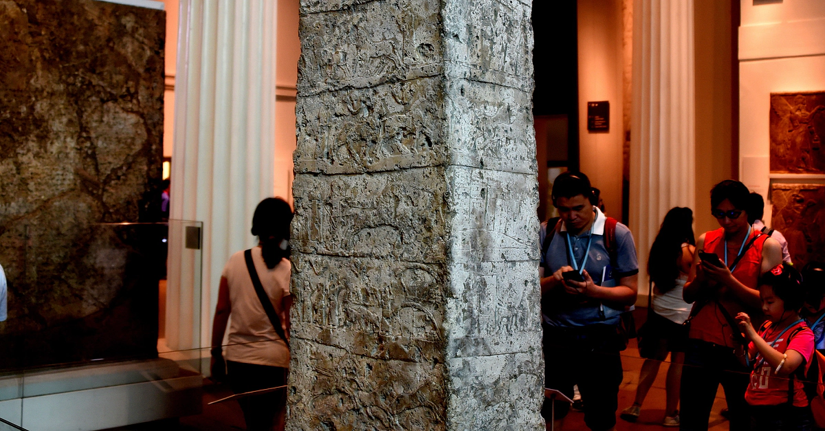 This limestone stela was excavated in 1853 CE. The incomplete inscription names Ashurnasirpal, probably Ashurnasirpal I (reigned 1049-1031 BCE). He is shown in his chariot fighting (at the top of the stela) and hunting (at the bottom), and taking part in ritual scenes. The middle scenes show booty and tribute being brought, but their order is uncertain. This is an early example of Assyrian narrative relief that developed into the palace reliefs of later periods. Assyrian, probably about 1050 BCE. From Mesopotamia Nineveh (modern-day Mosul Governorate, Iraq), between the Sennacherib's palace and the Ishtar temple. (The British Museum, London).