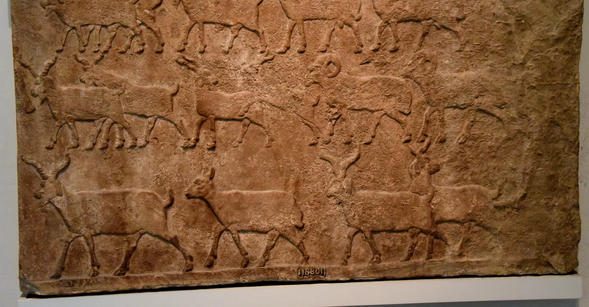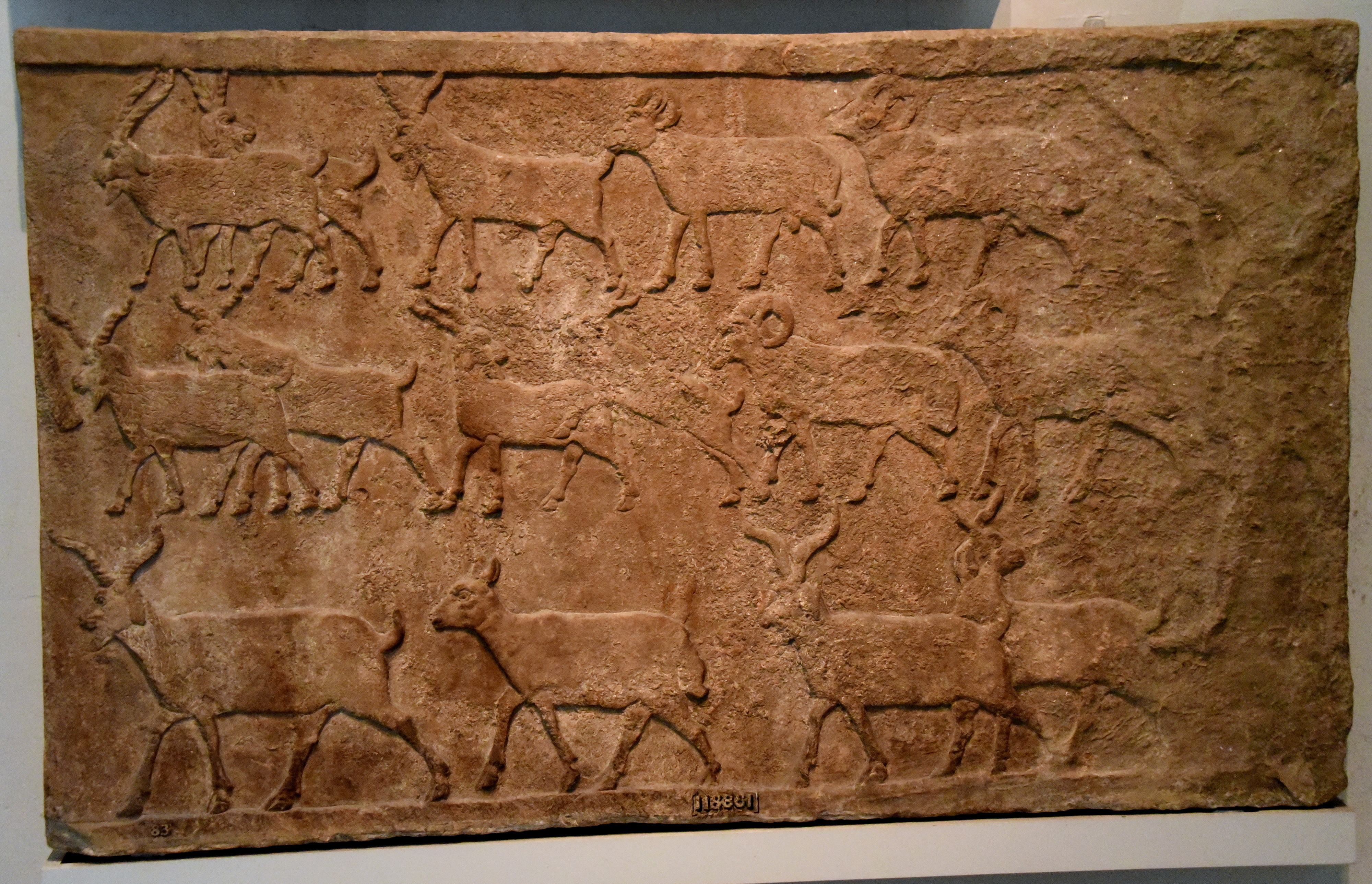 Sheep and goats, captured in a campaign against the Arabs are driven back to the Assyrian camp. This scene decorated the palace of King Tiglath-pileser III (reigned 744-727 BCE. Assyrian, about 728 BCE. From the Central Palace at Nimrud (ancient Kalhu), Mesopotamia, Iraq. (The British Museum. London).