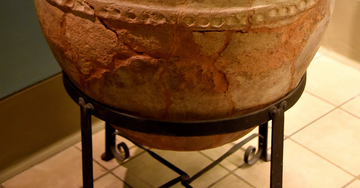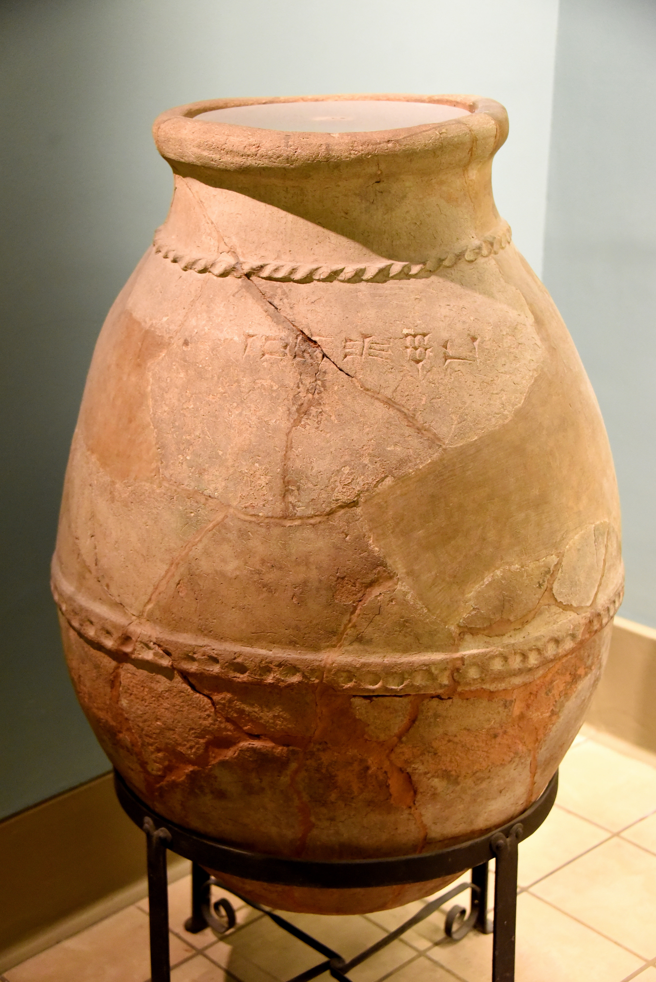 This jar was found in one of the wine-cellars in the arsenal at Nimrud (ancient Kalhu). It is marked in cuneiform with its capacity; 1 homer, 3 seah, 7 qa. In fact, it holds about 300 liters. Assyrian, late 7th century BCE. From Nimrud, Mesopotamia, Iraq. Lent by the Institute of Archaeology, University of London. (The British Museum, London).