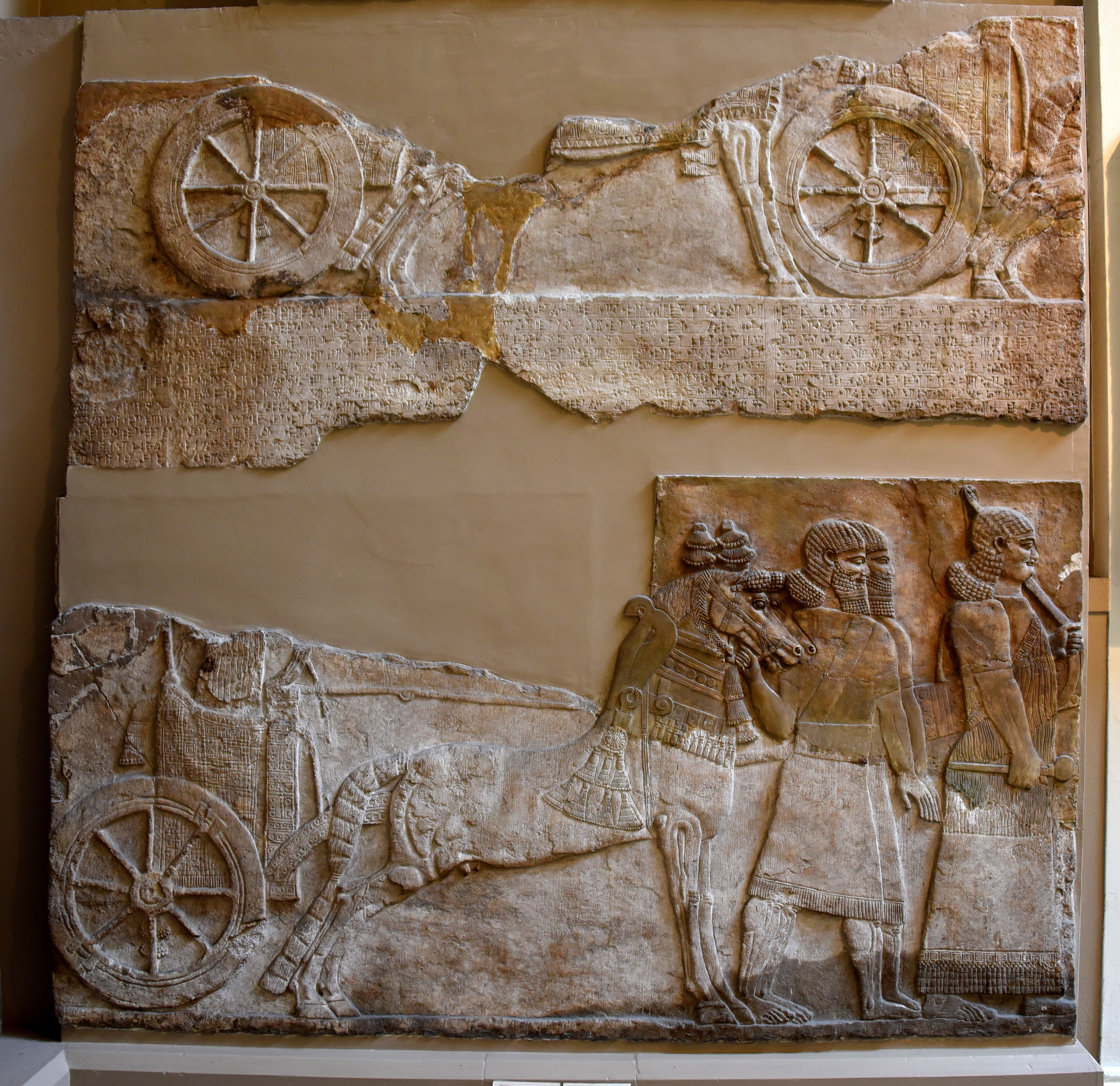One of a series, it shows two disconnected scenes. Above is part of a battle. Below, the royal chariot waits behind Tiglath-Pileser III, who was shown on a panel to the right. The writing in the middle deals with the Assyrian military campaigns in modern-day Syria and Iran in 738-737 BCE.