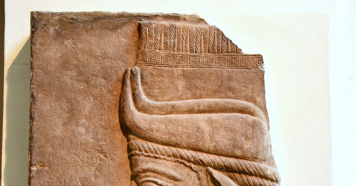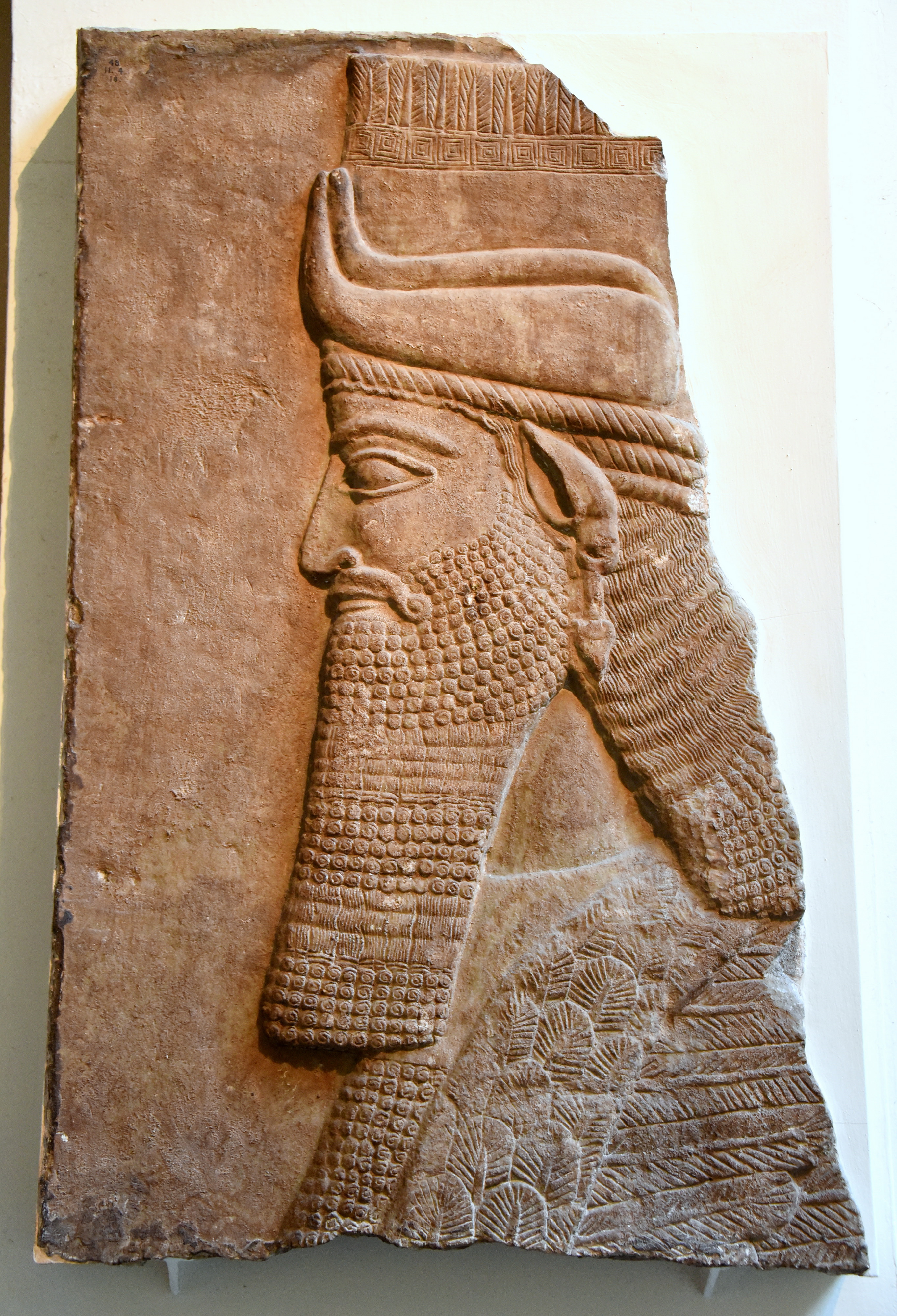 This fragment of a human-headed winged-bull, from Tiglath-pileser III's palace, is carved in low-relief like a wall panel. There is a marked contrast with the colossal figures in very high relief, of both earlier and later periods. Assyrian, reign of Tiglath-pileser III, about 728 BCE. From the Central Palace at Nimrud (ancient Kalhu), Mesopotamia, Iraq. (The British Museum, London).