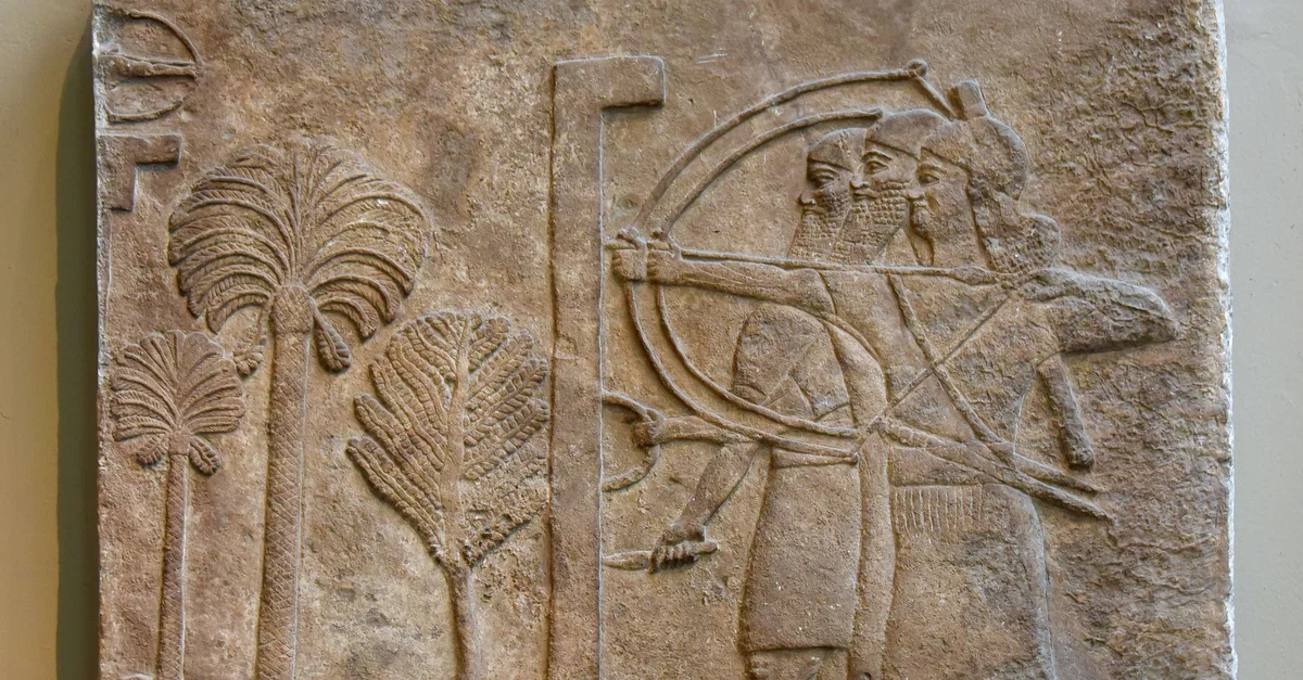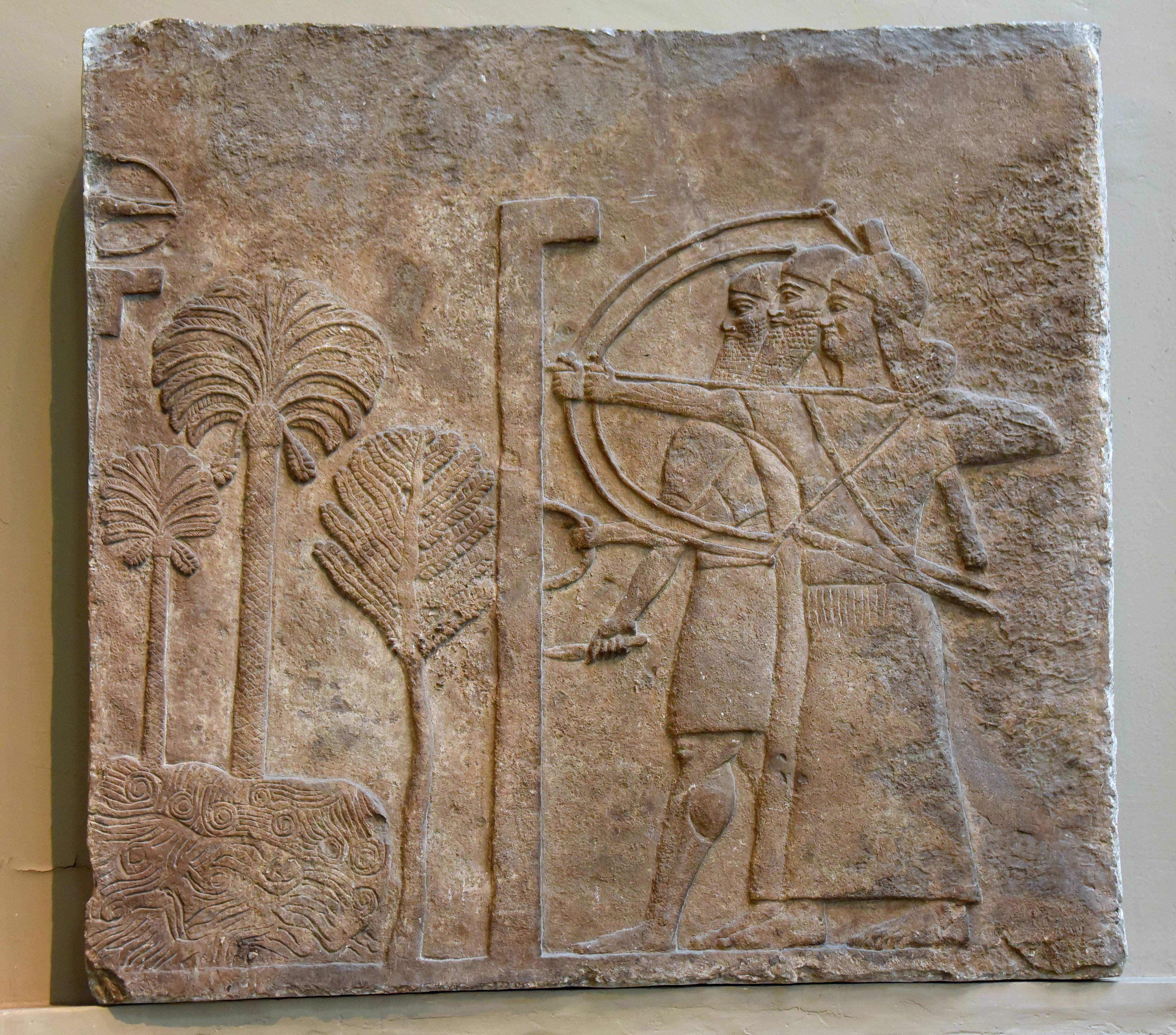 Date palms indicate that the city, most of which were on an adjacent slab, was probably Babylonia. It stood by a river or a canal. An Assyrian soldier holds a large body shield and two archers take aim.