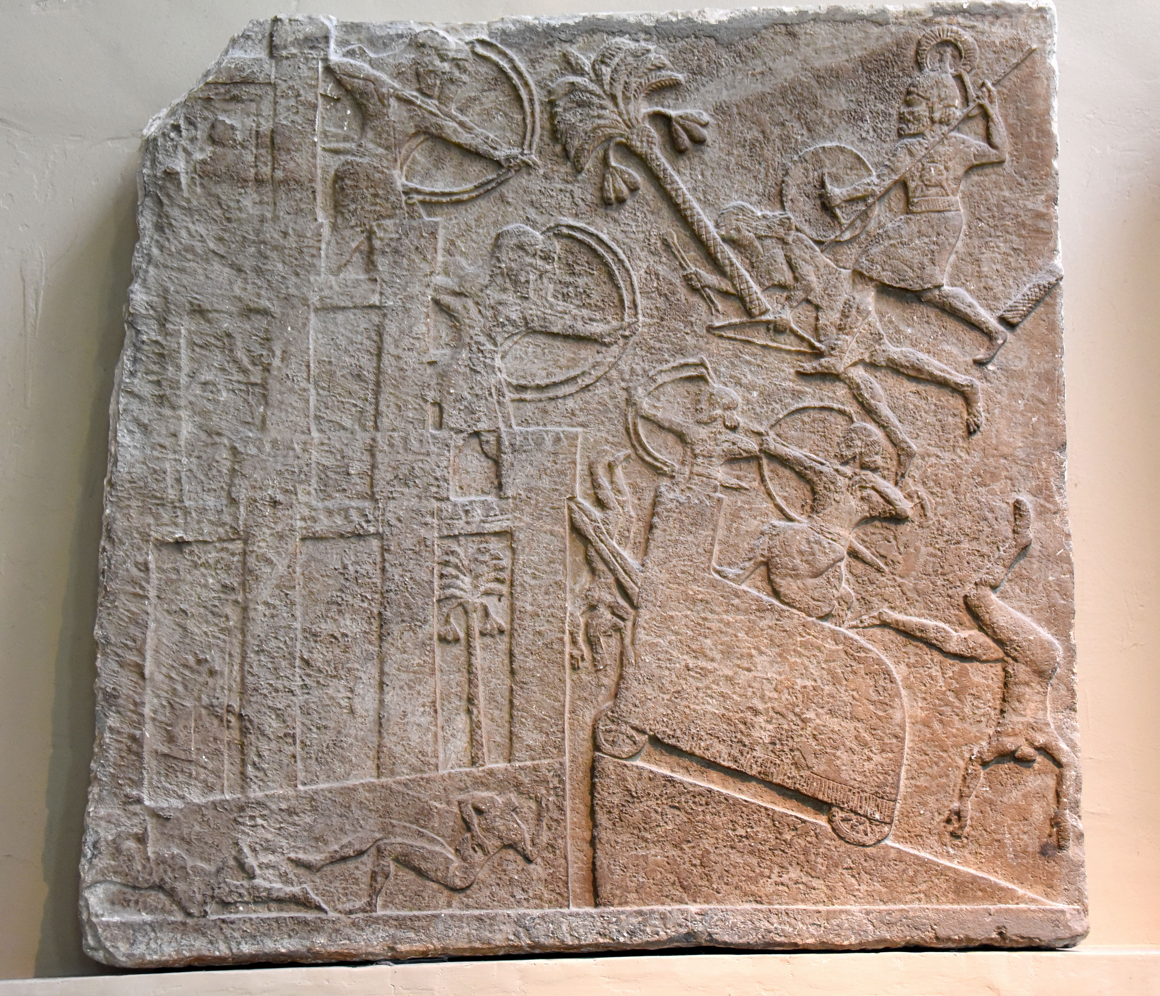 Date palms indicate that the city, most of which was on an adjacent slab, was probably Babylonia. The Assyrians have built a siege ramp against the walls, which they attack with a battering ram. An enemy archer is being killed beside a palm tree that has been felled, and headless corpses lie around the city.
