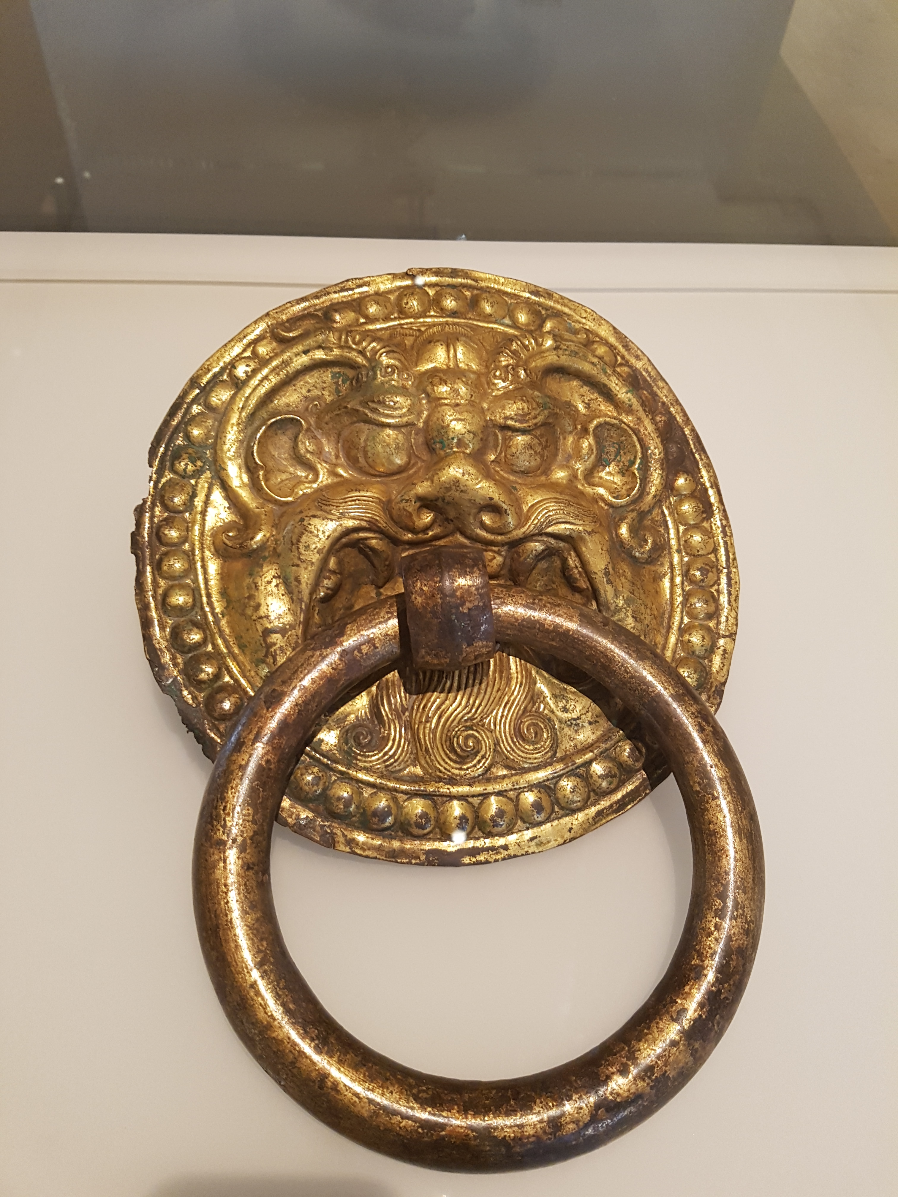 A gilded bronze Pushou door knob. 25.8 cm (634-907 CE). Excavated at the site of the Daming Palace, Xi'an, China in 1988 CE. Shaanxi History Museum. (Photo taken at the Art Gallery of NSW, Sydney Australia)