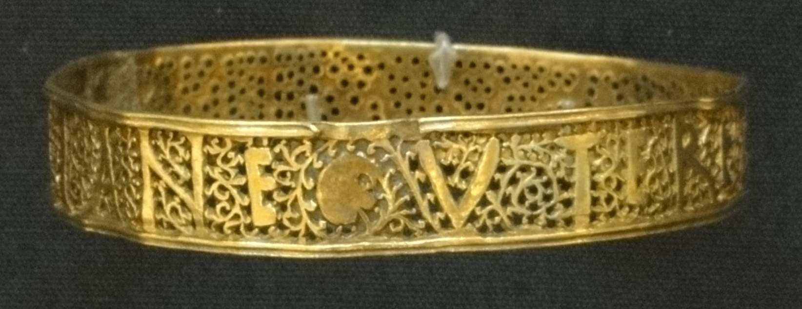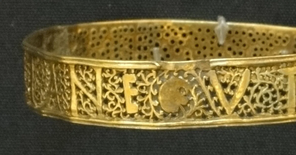 The Hoxne Hoard was discovered in Suffolk, in the east of England in 1992. The incredible collection contains 14,865 late-4th- and early-5th-century Roman gold, silver and bronze coins, and 200 items of silver tableware and gold jewellery. The hoard amounts to a total of 7.7lb of gold and 52.4 lb of silver. The inscription on the bangle reads VTERE FELIX DOMINA IVLIANE ("Use [this] happily lady Juliane"), which obviously indicates the name of the owner Juliane.