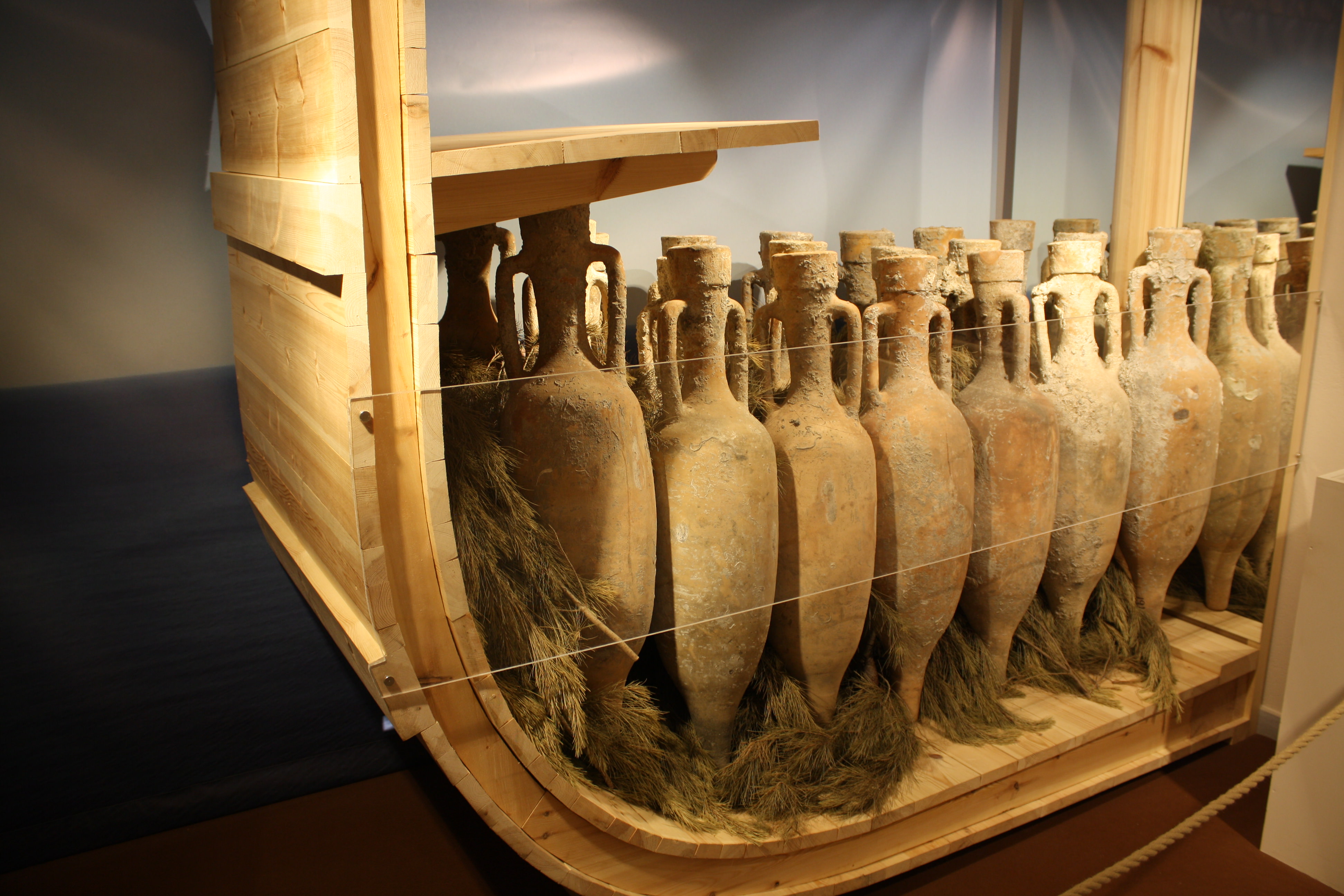 A reconstruction showing how amphorae were packed in sailing vessels for transportation across the ancient Mediterranean. (Empuries Archaeological Site Museum, Spain)