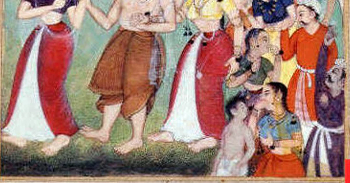 Kunti leads the blindfolded Gandhari and a blind Dhritarashtra, parents of the 100 Kauravas, into exile in a scene from the Mahabharata. 16th century CE print by Dhanu.