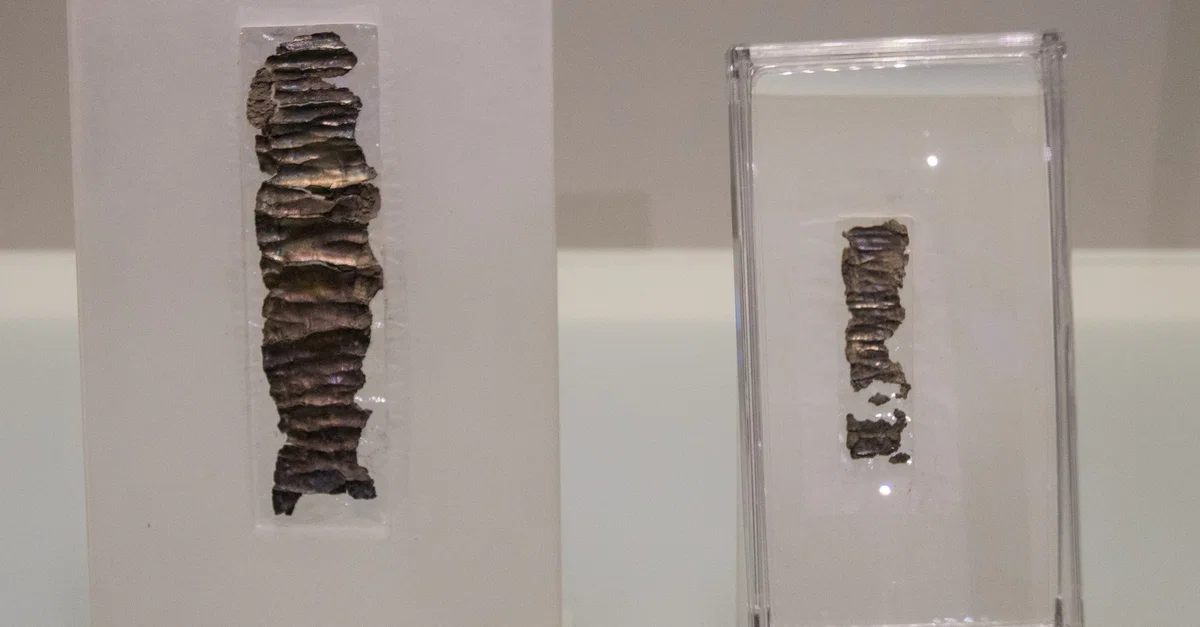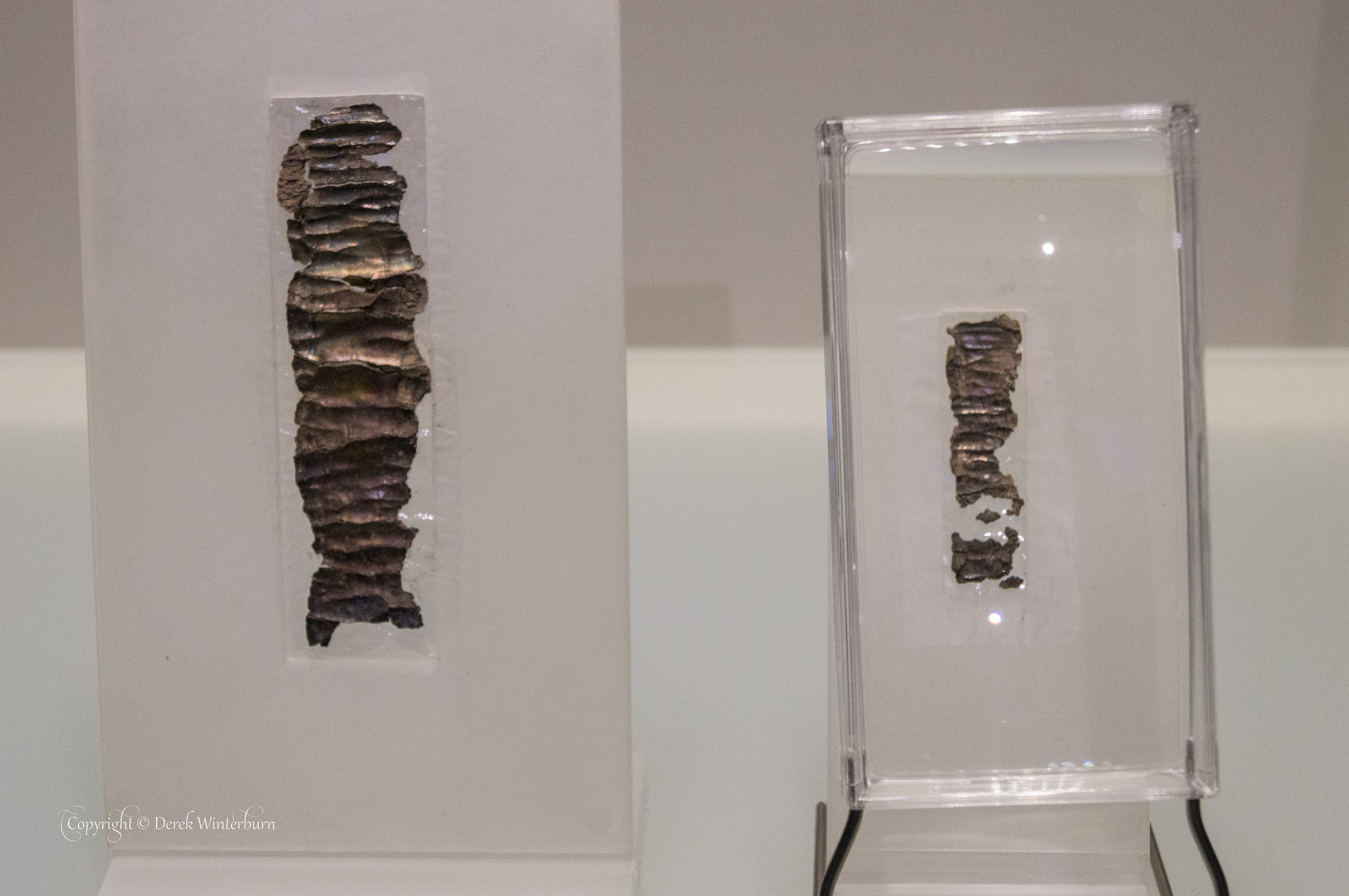 Two silver amulets with inscriptions to ward off evil. Found at Ketef Hinnom, currently on display in the Israel Museum, Jerusalem.