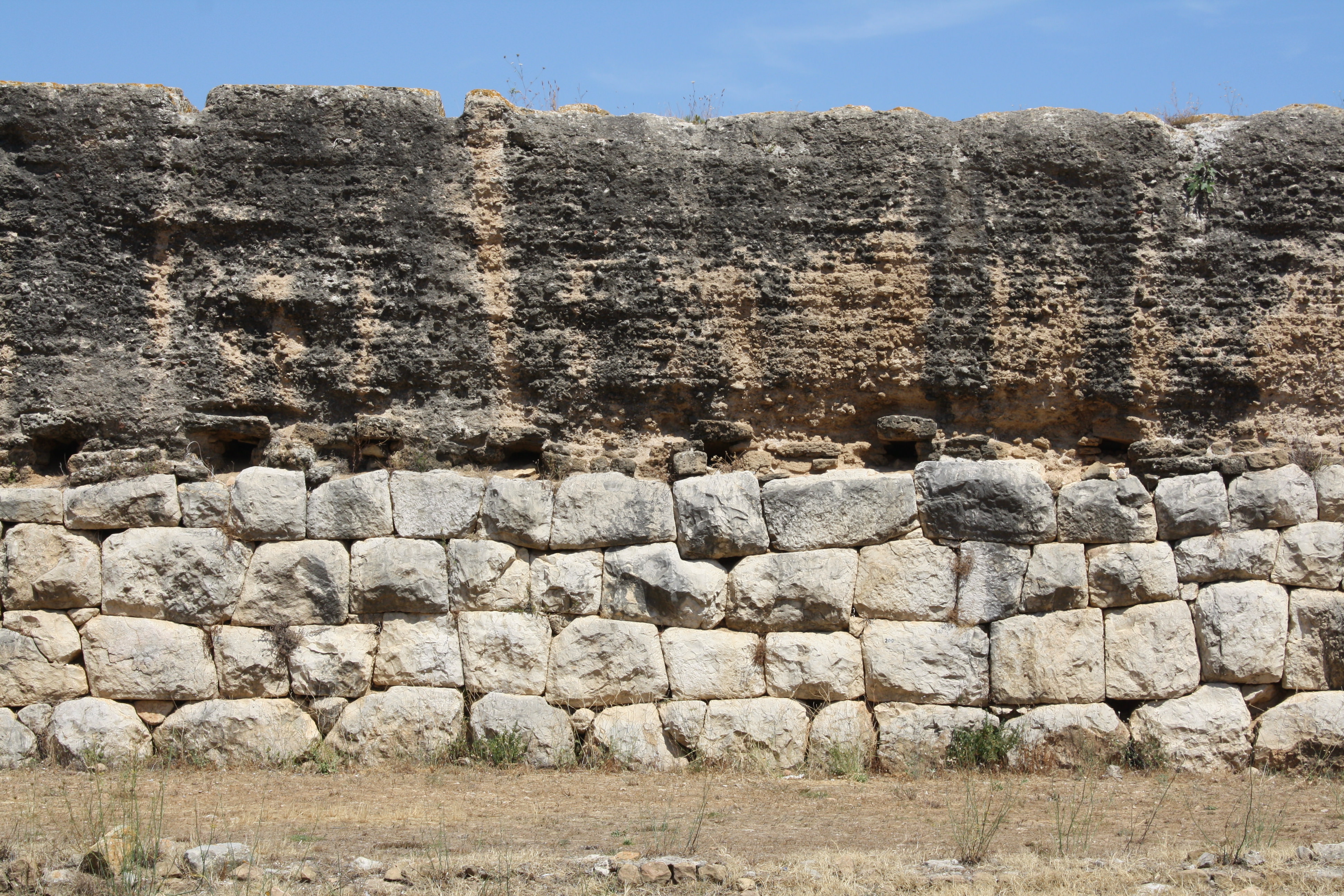 A section of the Roman city-wall of Empuries, Spain. 1st century BCE. The base of the wall was made using calcareous rock while the upper portion is of Roman concrete (opus caementicium).
