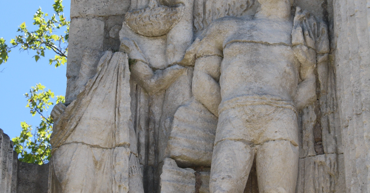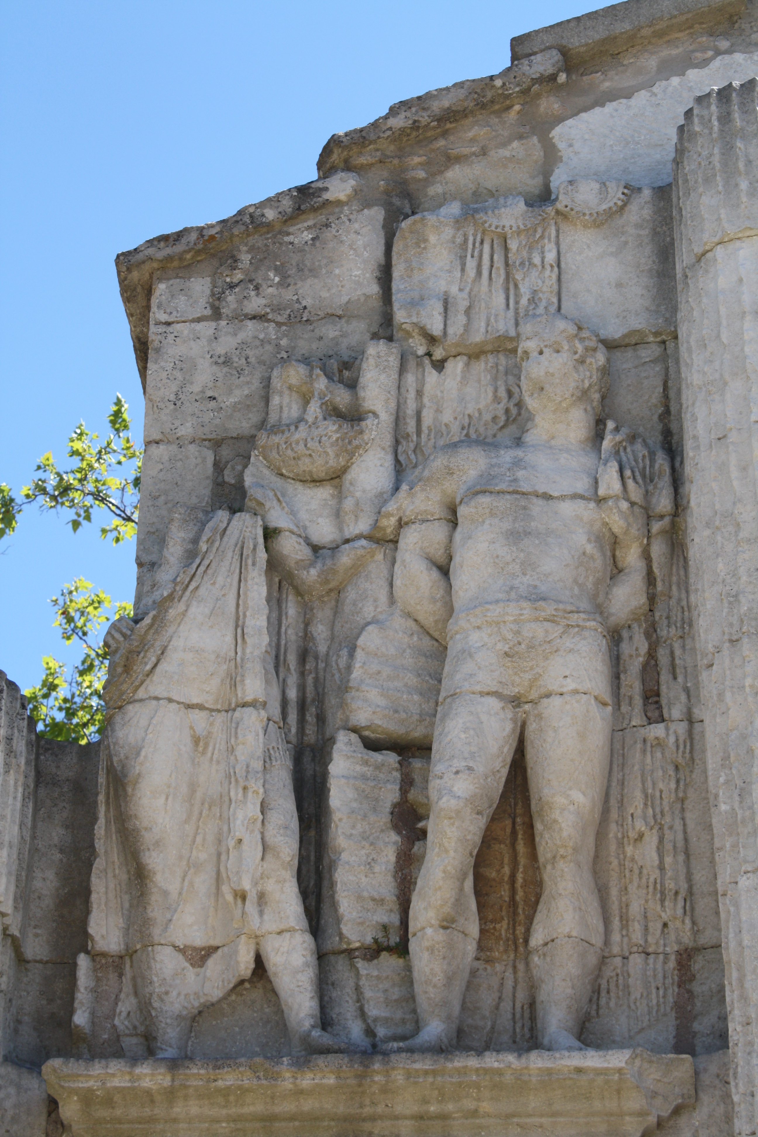 A detail of the triumphal arch at Glanum, southern France, showing an enslaved Gaul. The monument was built in the early 1st century CE, perhaps to commemorate the city's new status as a Roman colony. The top third is now missing.