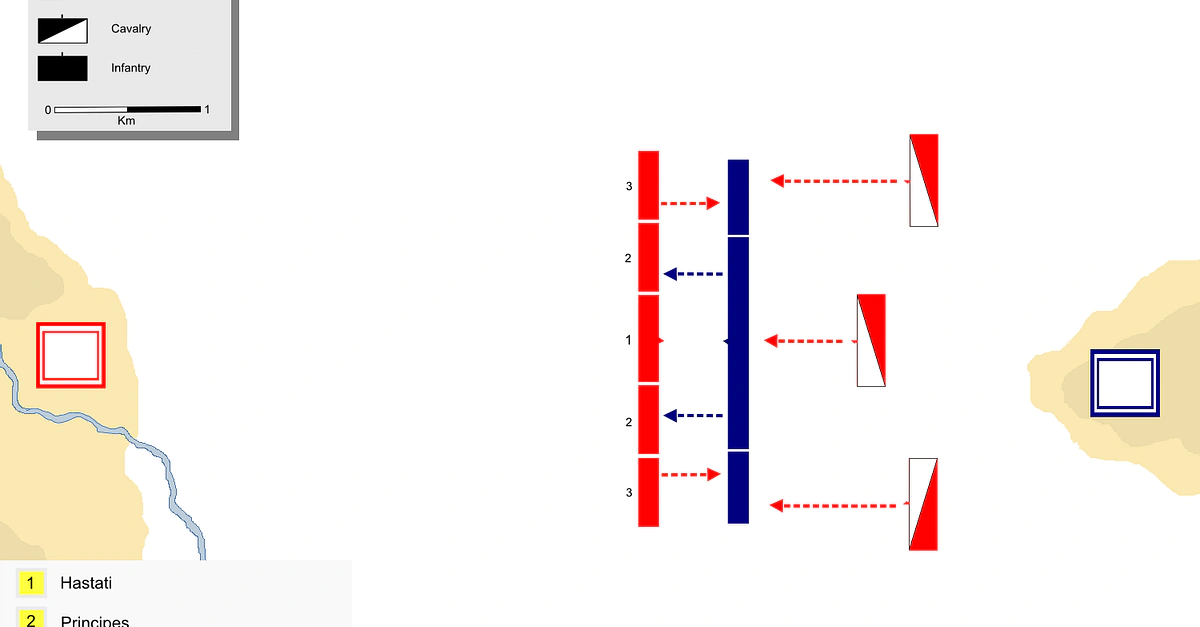 The Battle of Zama (202 BCE). Scipio and Hannibal rearrange their troops in a single line and battle remains stalemate until Roman cavalry returns and attacks Hannibal's infantry at the rear.