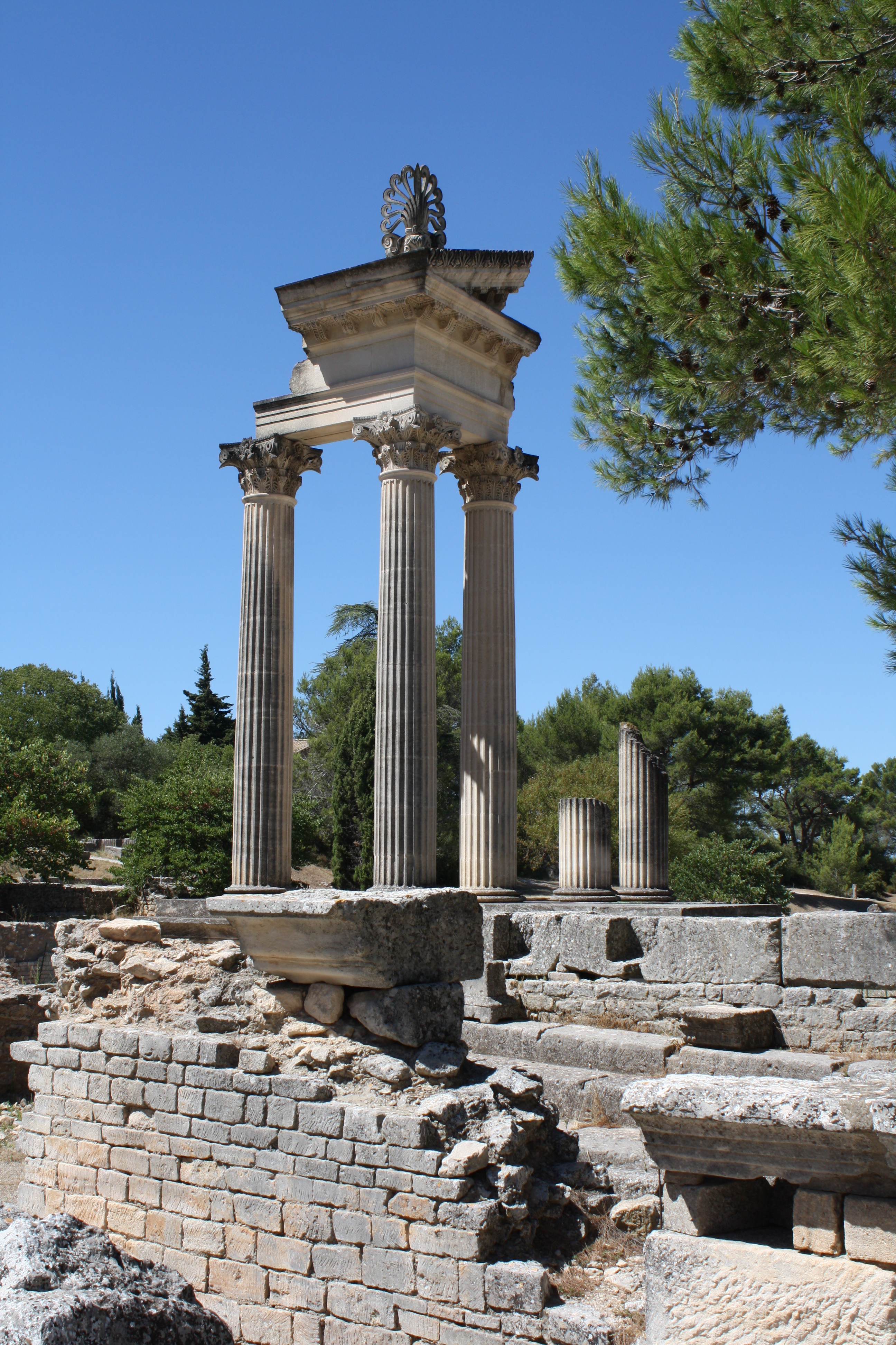 The faithfully reconstructed corner of the smaller of two twin temples dedicated to the imperial cult at Glanum, southern France. c. 20 BCE.
