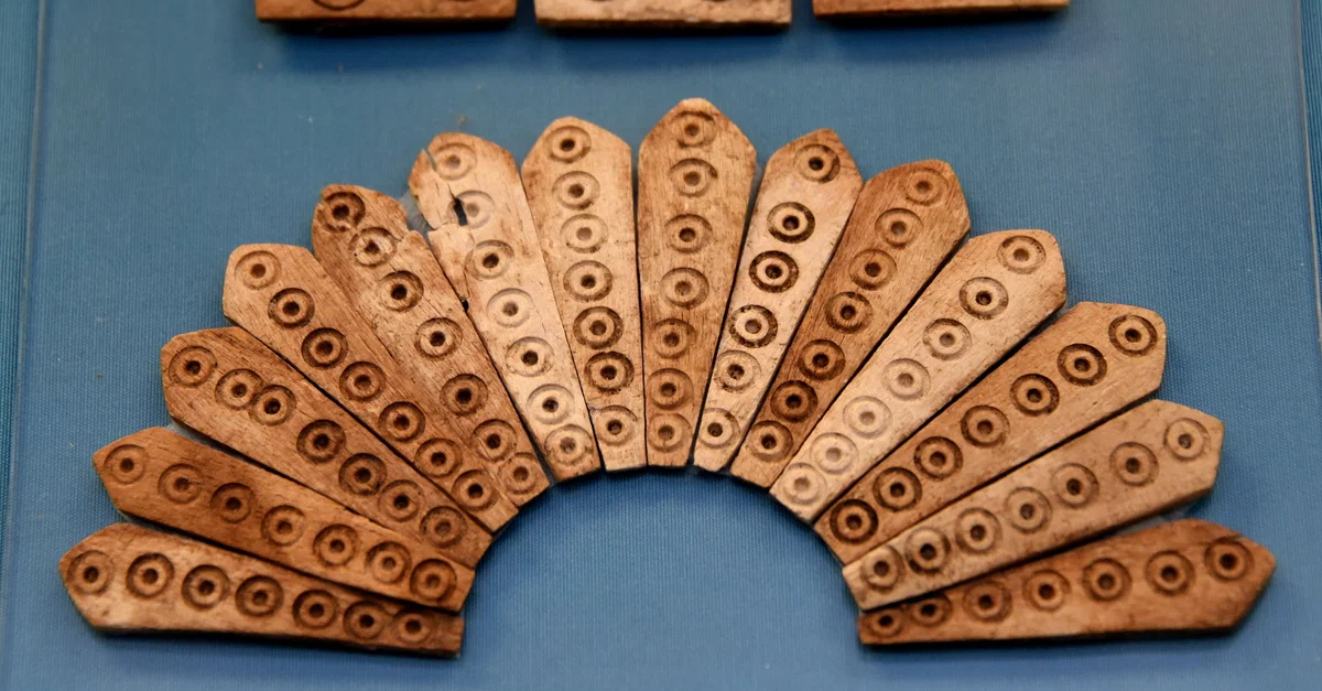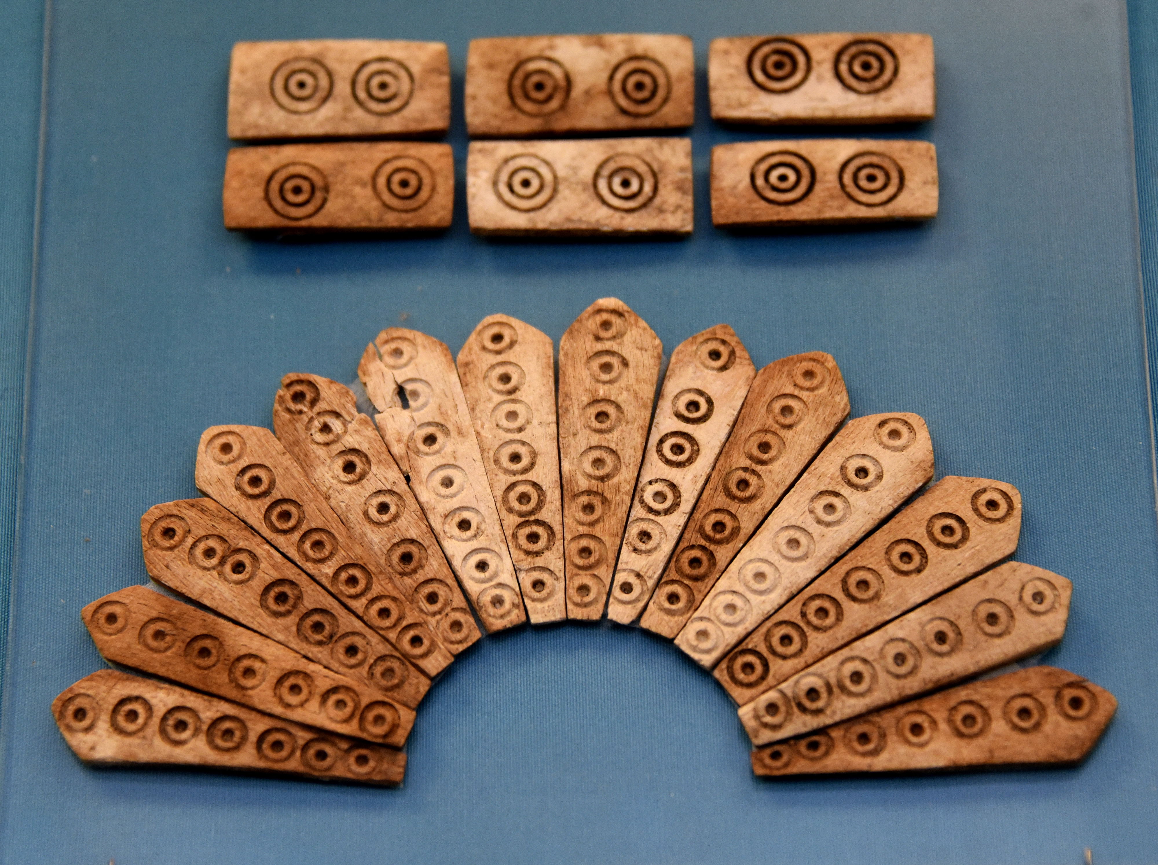 These finely worked fragments were found scattered on the floor of tomb P19. Some were undoubtedly applied to small rectangular or circular wooden boxes, parts of which were recovered. Others might have been used to ornament items of furniture, such as a stool or table. MBIIB-C, 1750-1700 BCE. From Jericho, West Bank. (The British Museum, London).