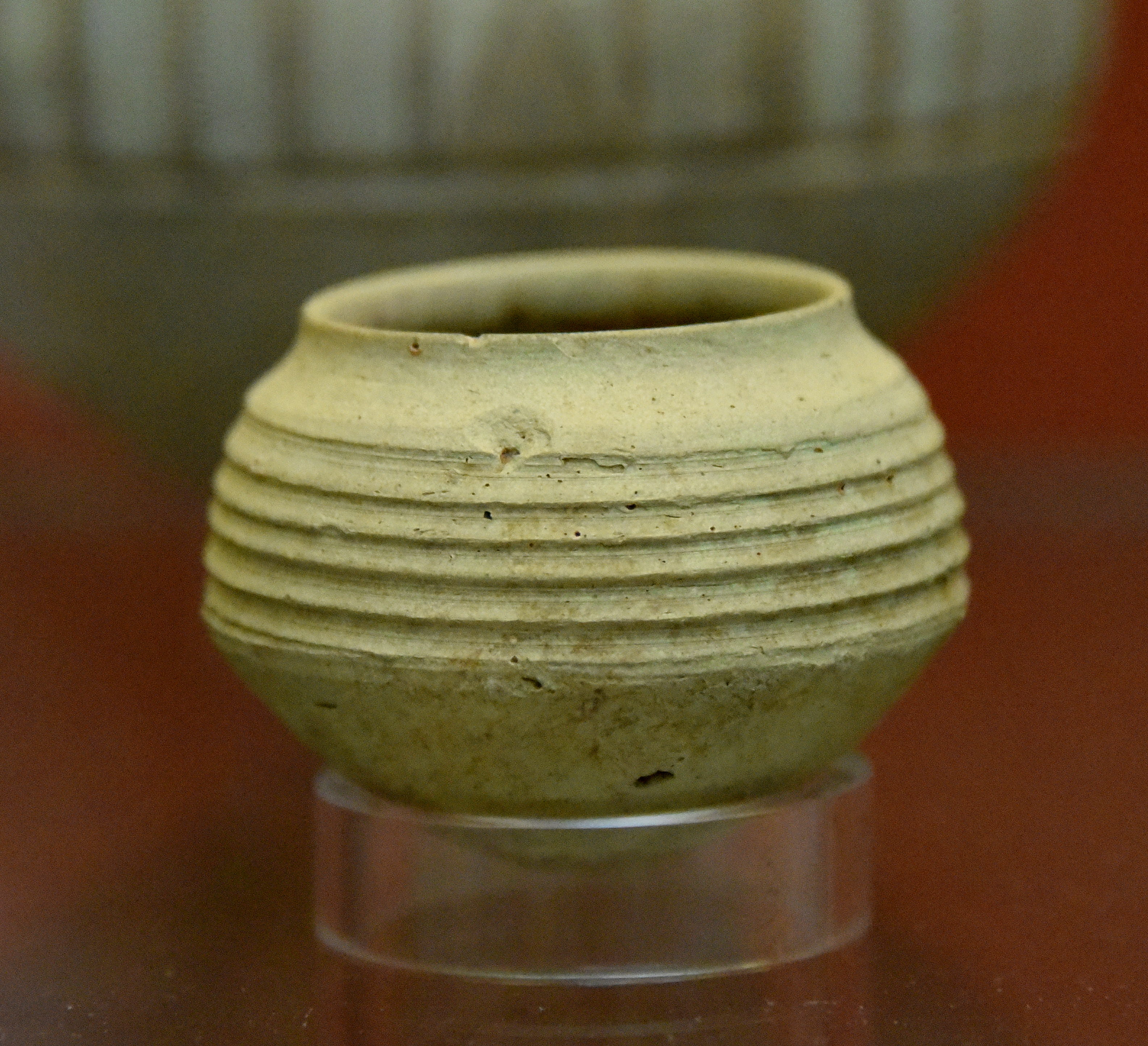 This pottery cup was wheel-made and unpainted. It has a pointed base. Excavated by Robin Hamilton and Reginald Thompson in 1930-1931 season. Ninevite 5 period, 2750-2500 BCE. From Nineveh, northern Mesopotamia, modern-day Iraq. (The British Museum, London). The period's name, Ninevite 5, came after the 5th level in a deep excavation trench at Nineveh, Northern Mesopotamia, where it belonged to a distinctive culture. This was partly contemporary with the Early Dynastic Period in the south. Ceramic vessels were decorated with either painted or incised designs.