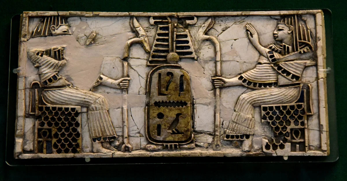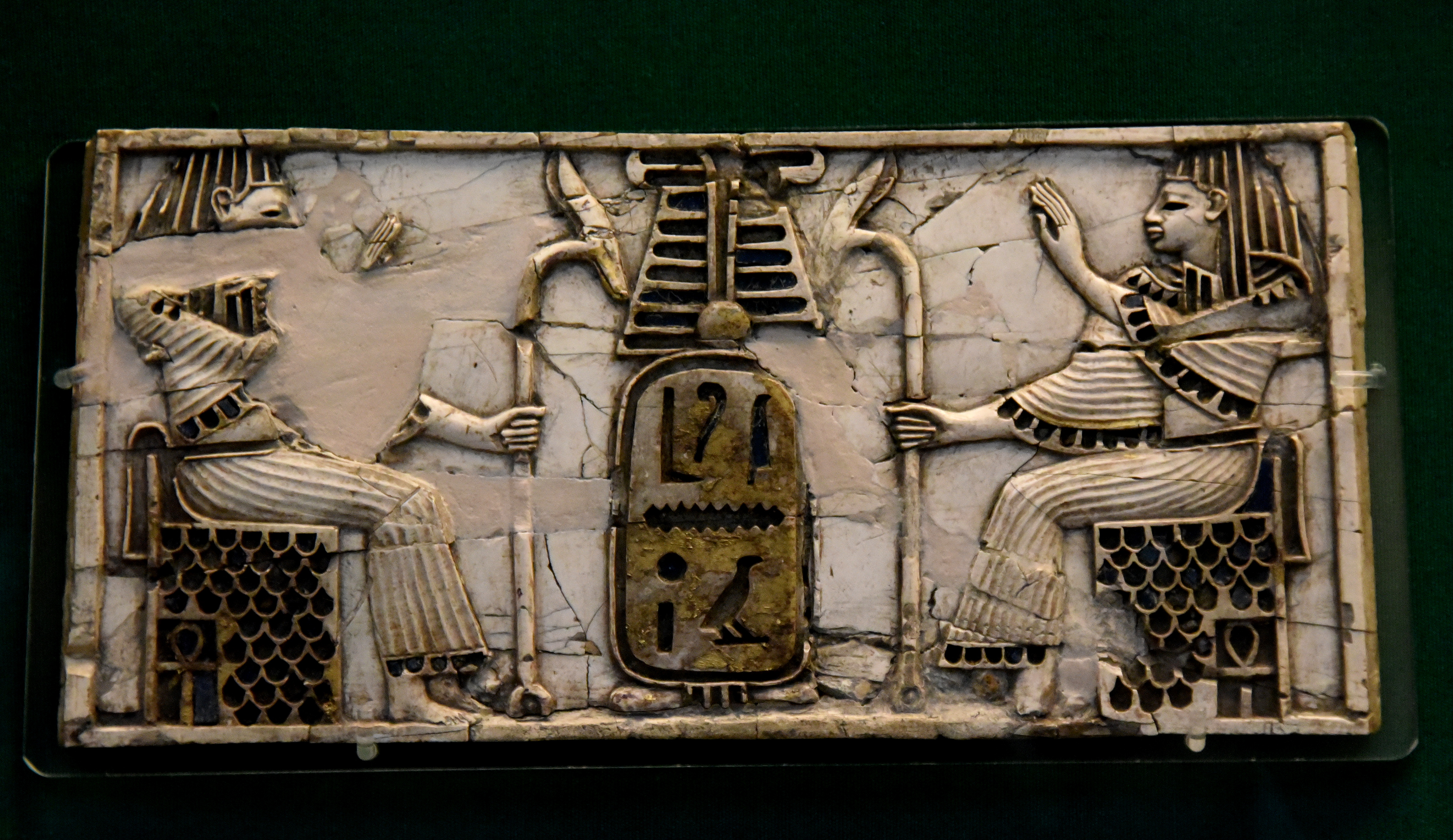 Two figures sit facing each-other either side of a cartouche surmounted by two feathers. The inscription consisting of Egyptian hieroglyphs, cannot be read, the signs have been treated in a purely decorative manner by the Phoenician craftsmen. Some of the original colored inlay and gold leaf overlay survive. Excavated by Sir Henry Layard; acquisition date 1848. Neo-Assyrian Period, 9th to 8th centuries BCE. From the doorway between Rooms V and W of the North-West Palace at Nimrud (ancient Kalhu), Mesopotamia, modern-day Iraq. (The British Museum, London).