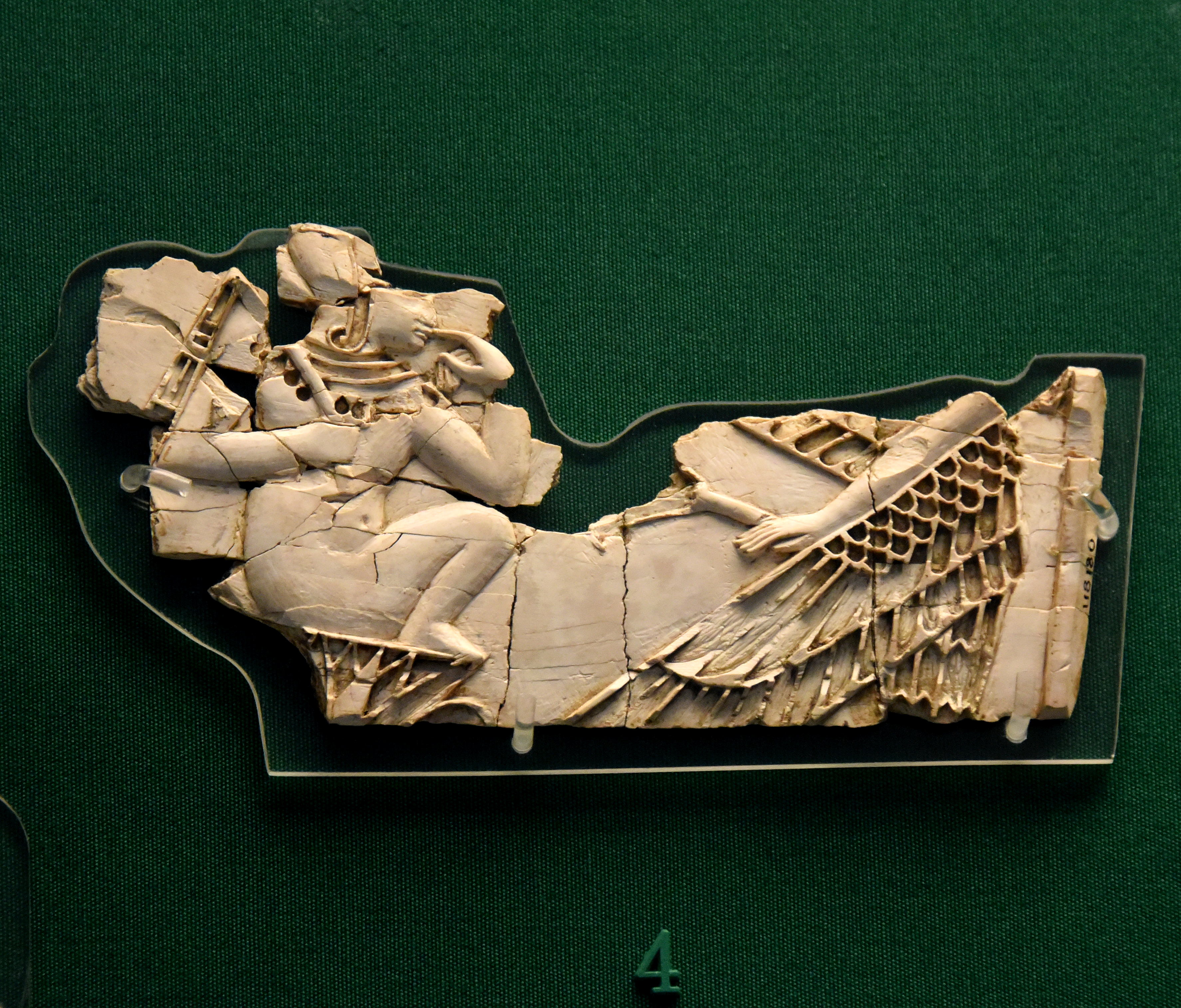 On the left is the naked infant Horus sitting on a lotus flower with his finger in his mouth. Facing him is a winged goddess, possibly Isis, who extends a lotus flower towards him. This fine piece was originally inlaid with colored glass or faience. Excavated by Sir Henry Layard; acquisition date 1848. Neo-Assyrian Period, 9th to 8th centuries BCE. From the doorway between Room V and W of the North-West Palace at Nimrud (ancient Kalhu), Mesopotamia, modern-day Iraq. (The British Museum, London).
