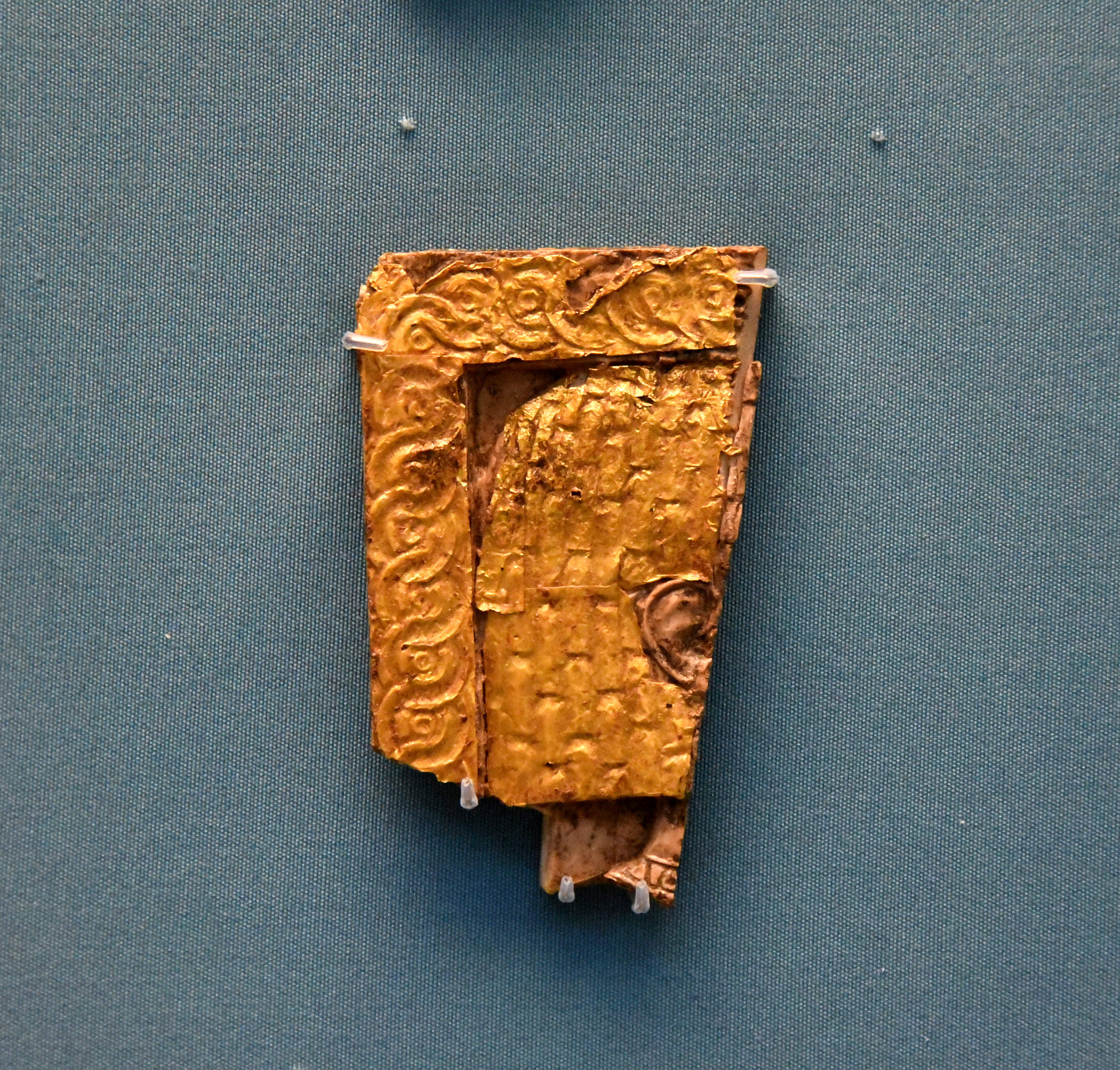 Never seen by the public before 2011. A small fragment of an ivory plaque from Nimrud. It shows what appears to the right side of the head and neck, as well as right ear of a a figure. The golden overlay is still intact. Neo-Assyrian Period, 9th to 8th centuries BCE. From Nimrud (ancient Kalhu), Mesopotamia, modern-day Iraq. (The British Museum, London). New acquisition by the British Museum in 2011, made possible by generous support from donors including the British Museum Friends, the Art Fund and the National Heritage Memorial Fund. These ivories were excavated by the British School of Archaeology in Iraq, now the British Institute for the Study of Iraq (BISI), between 1949 and 1963, by Sir Max Mallowan.