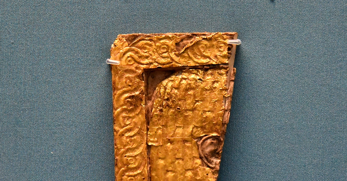 Never seen by the public before 2011. A small fragment of an ivory plaque from Nimrud. It shows what appears to the right side of the head and neck, as well as right ear of a a figure. The golden overlay is still intact. Neo-Assyrian Period, 9th to 8th centuries BCE. From Nimrud (ancient Kalhu), Mesopotamia, modern-day Iraq. (The British Museum, London). New acquisition by the British Museum in 2011, made possible by generous support from donors including the British Museum Friends, the Art Fund and the National Heritage Memorial Fund. These ivories were excavated by the British School of Archaeology in Iraq, now the British Institute for the Study of Iraq (BISI), between 1949 and 1963, by Sir Max Mallowan.