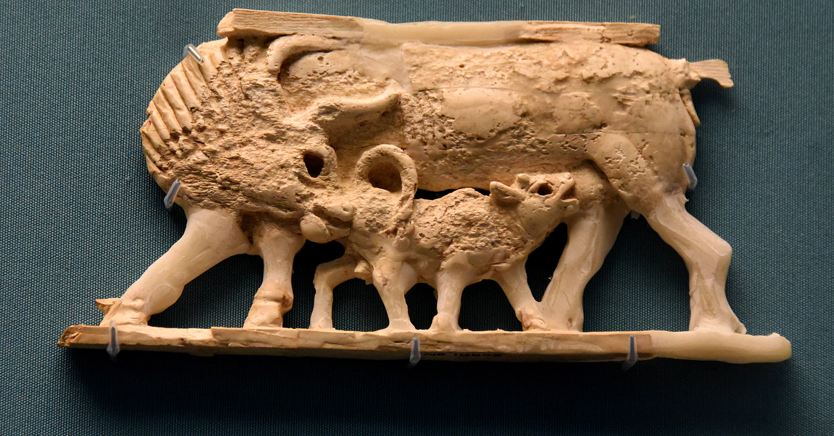 Never seen by the public before 2011. A small fragment of an ivory plaque from Nimrud. A standing cow turns her head towards a small calf. The calf appears to suckle milk from the cow's nipples. Neo-Assyrian Period, 9th to 8th centuries BCE. From Nimrud (ancient Kalhu), Mesopotamia, modern-day Iraq. (The British Museum, London). New acquisition by the British Museum in 2011, made possible by generous support from donors including the British Museum Friends, the Art Fund and the National Heritage Memorial Fund. These ivories were excavated by the British School of Archaeology in Iraq, now the British Institute for the Study of Iraq (BISI), between 1949 and 1963, by Sir Max Mallowan.