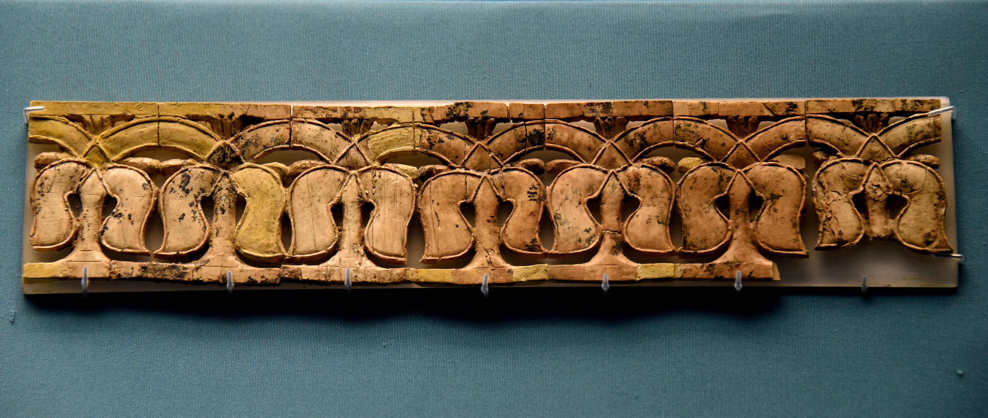 Never seen by the public before 2011. A small fragment of an ivory plaque from Nimrud. There are repeated motifs of small stylized palm trees, arranged horizontally. Neo-Assyrian Period, 9th to 8th centuries BCE. From Nimrud (ancient Kalhu), Mesopotamia, modern-day Iraq. (The British Museum, London). New acquisition by the British Museum in 2011, made possible by generous support from donors including the British Museum Friends, the Art Fund and the National Heritage Memorial Fund. These ivories were excavated by the British School of Archaeology in Iraq, now the British Institute for the Study of Iraq (BISI), between 1949 and 1963, by Sir Max Mallowan.