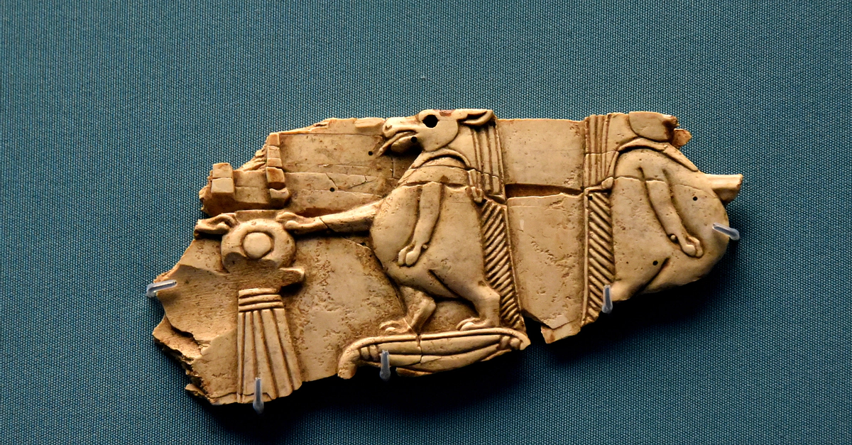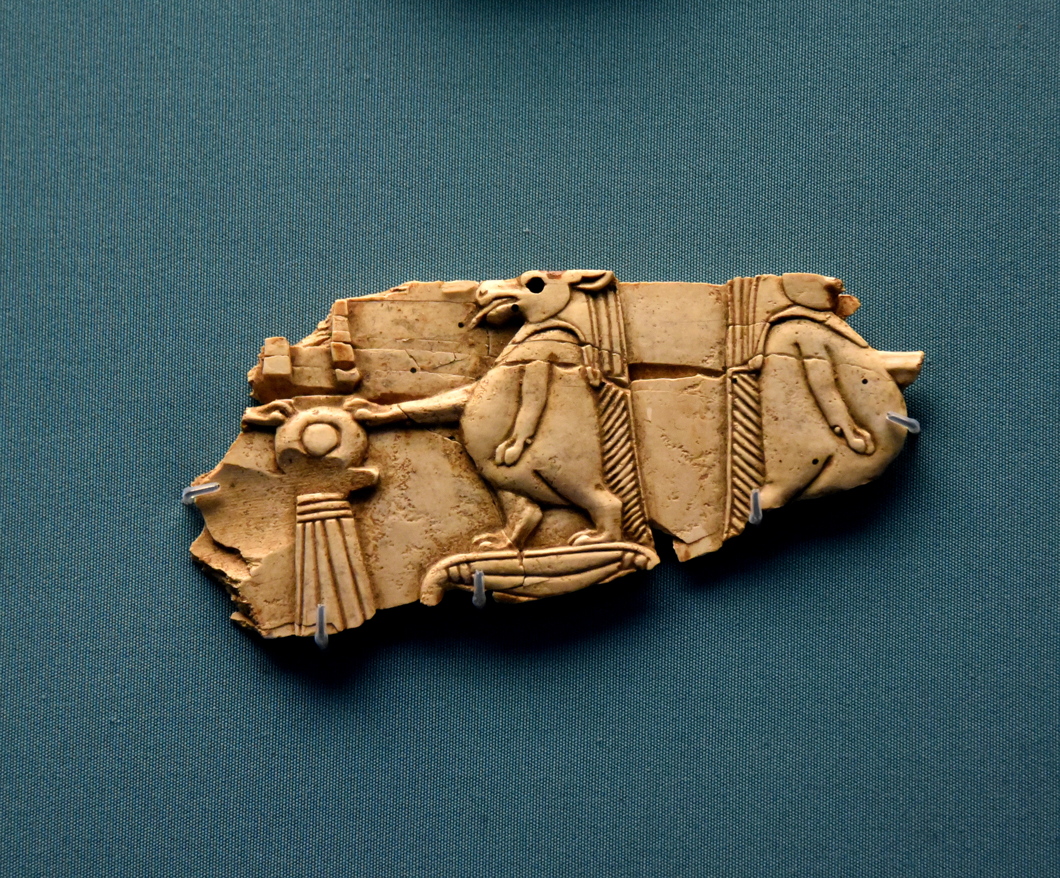 Never seen by the public before 2011. A small fragment of an ivory plaque from Nimrud. Two figures of the Egyptian goddess Tawaret (the demon-wife of Apep and the first god of evil) can be seen. Phoenician art. Neo-Assyrian Period, 9th to 8th centuries BCE. From Nimrud (ancient Kalhu), Mesopotamia, modern-day Iraq. (The British Museum, London). New acquisition by the British Museum in 2011, made possible by generous support from donors including the British Museum Friends, the Art Fund and the National Heritage Memorial Fund. These ivories were excavated by the British School of Archaeology in Iraq, now the British Institute for the Study of Iraq (BISI), between 1949 and 1963, by Sir Max Mallowan.