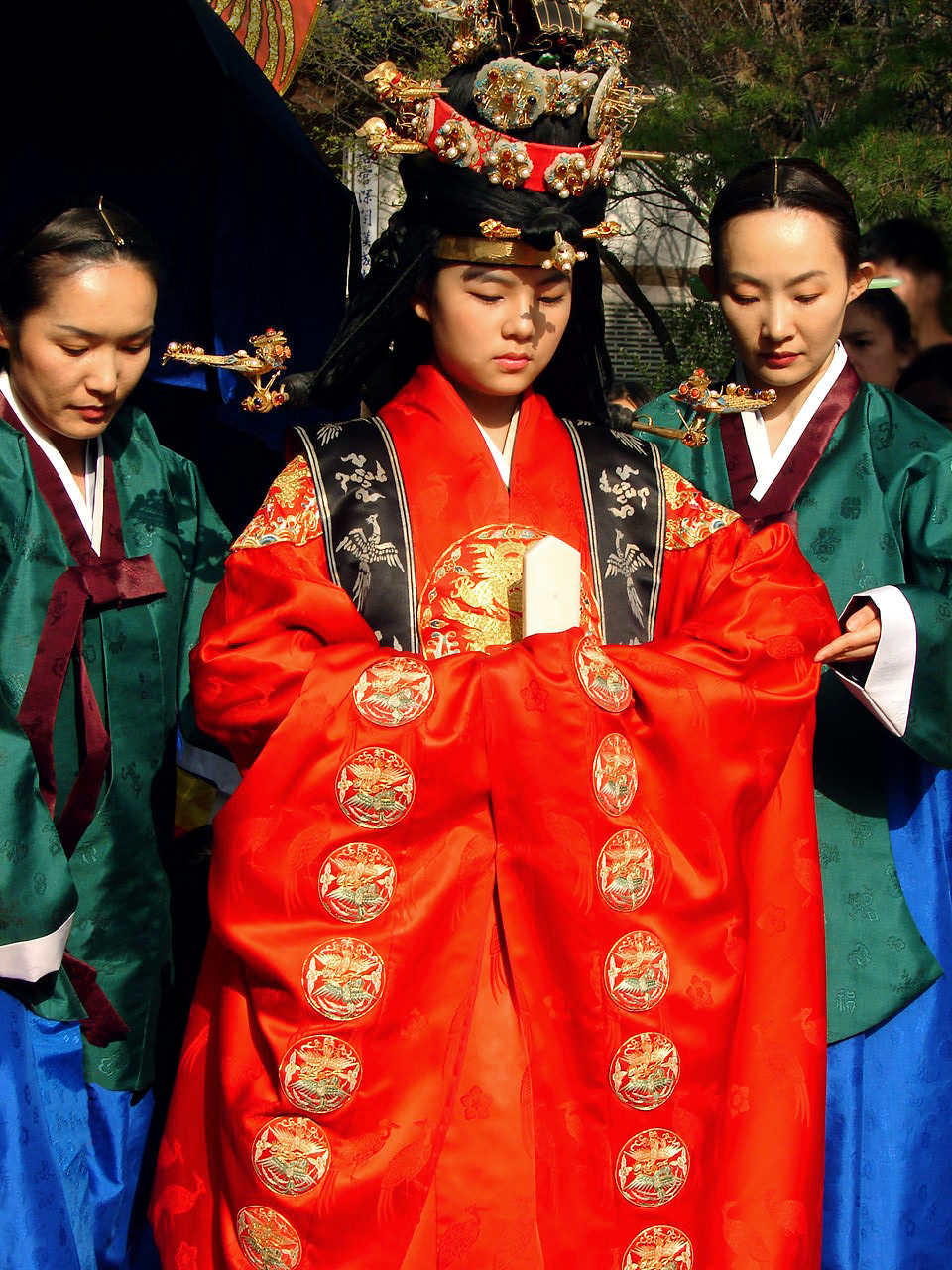 A modern re-enactment of a traditional Korean wedding. Such richly embroidered clothes could only be worn by women of the royal or ‘sacred bone’ (seonggol) class in the Korean bone rank system used in the Silla period (57 BCE - 935 CE).