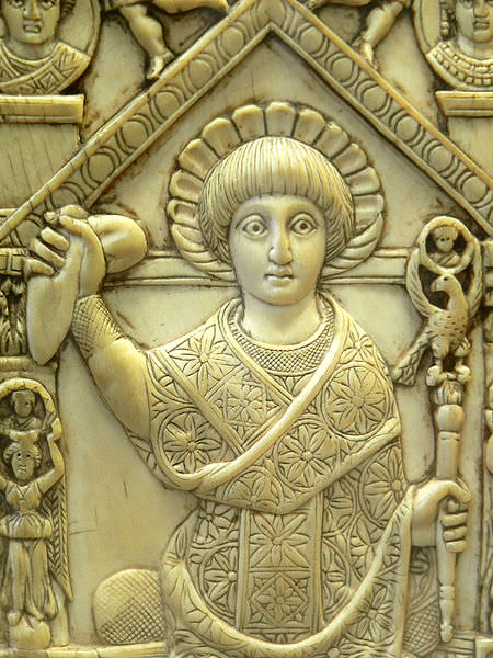 Flavius Anastasius Paulus Probus Sabinianus Pompeius (consul 517 CE) in consular garb, holding a sceptre and the mappa, a piece of cloth used to signal the start of chariot races at the Hippodrome. Ivory panel from his consular diptych.
