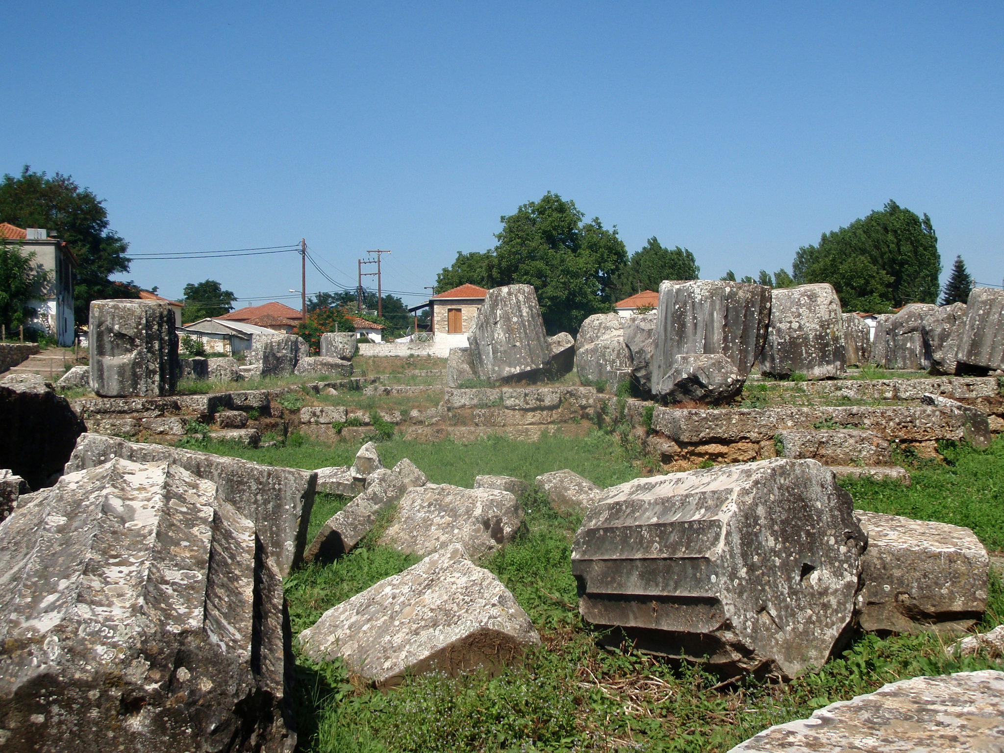 Column drums and the stylobate of the 4th century BCE temple of Athena at Tegea in the Peloponnese. Originally the temple had 6 x 14 columns and was part of the sanctuary dedicated to Athena Alea.