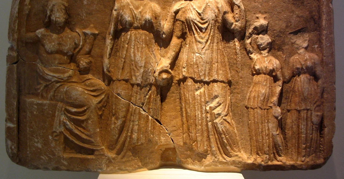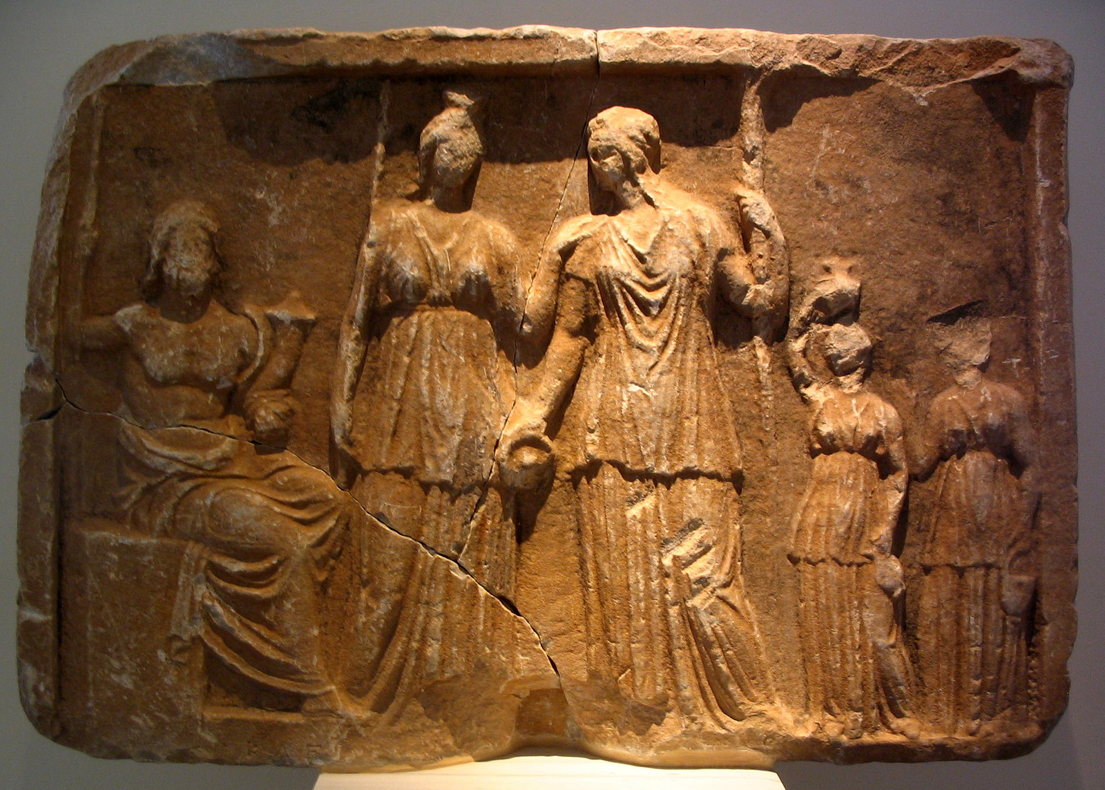 A marble plaque from Tegea depicting Pluto, Demeter and Persephone with worshippers. 4th-3rd century BCE. (National Archaeological Musem, Athens)