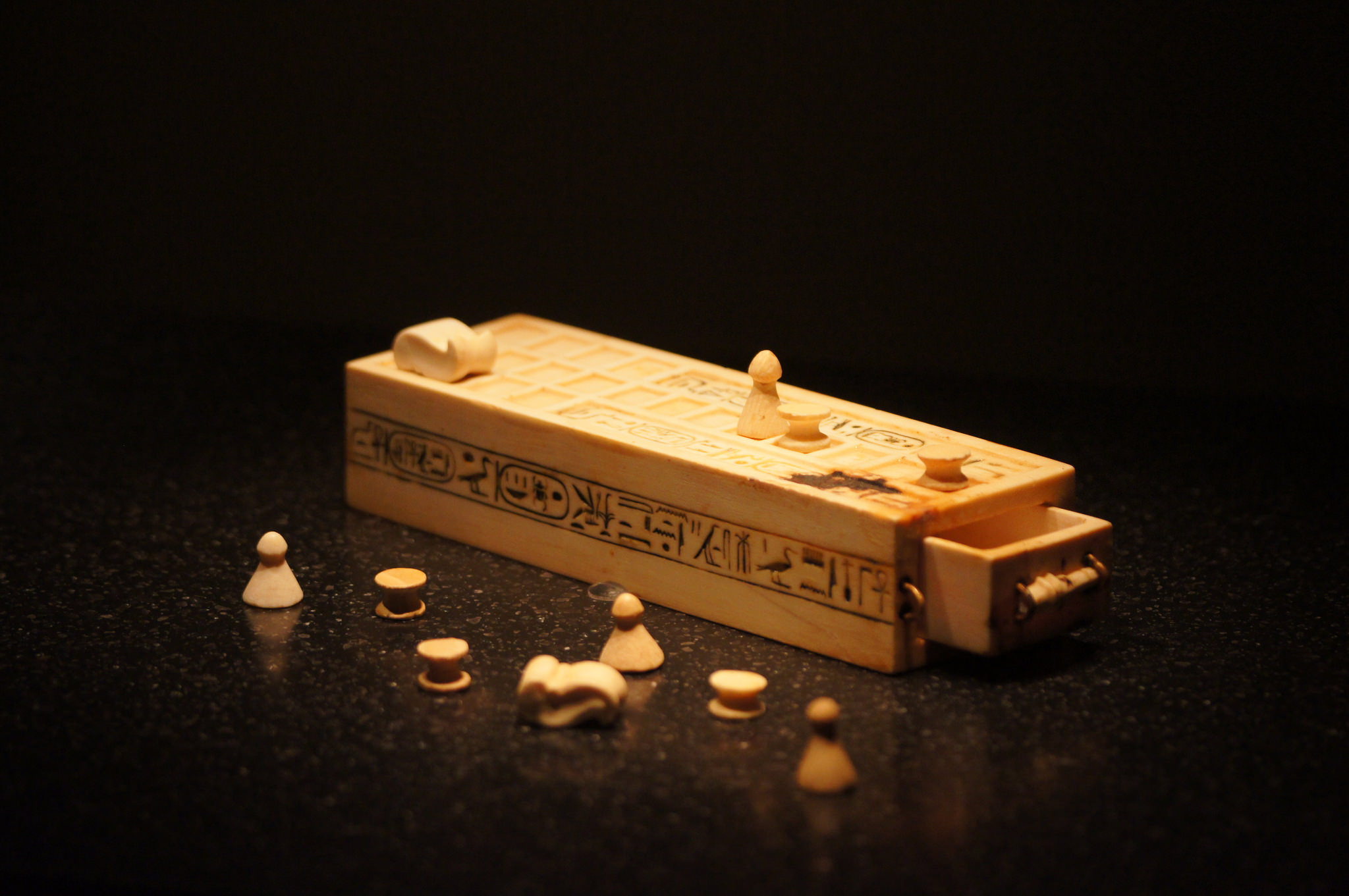 A game box and pieces for playing the game of senet, found within the intact KV62 tomb of King Tutankhamun, 18th Dynasty, New Kingdom of Egypt.
