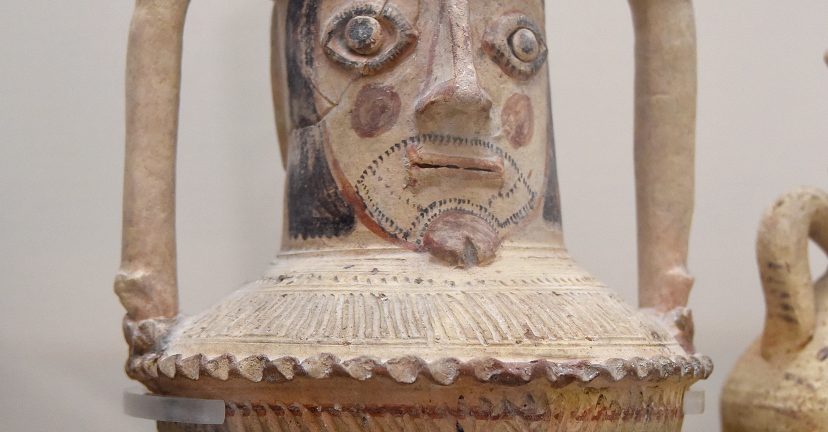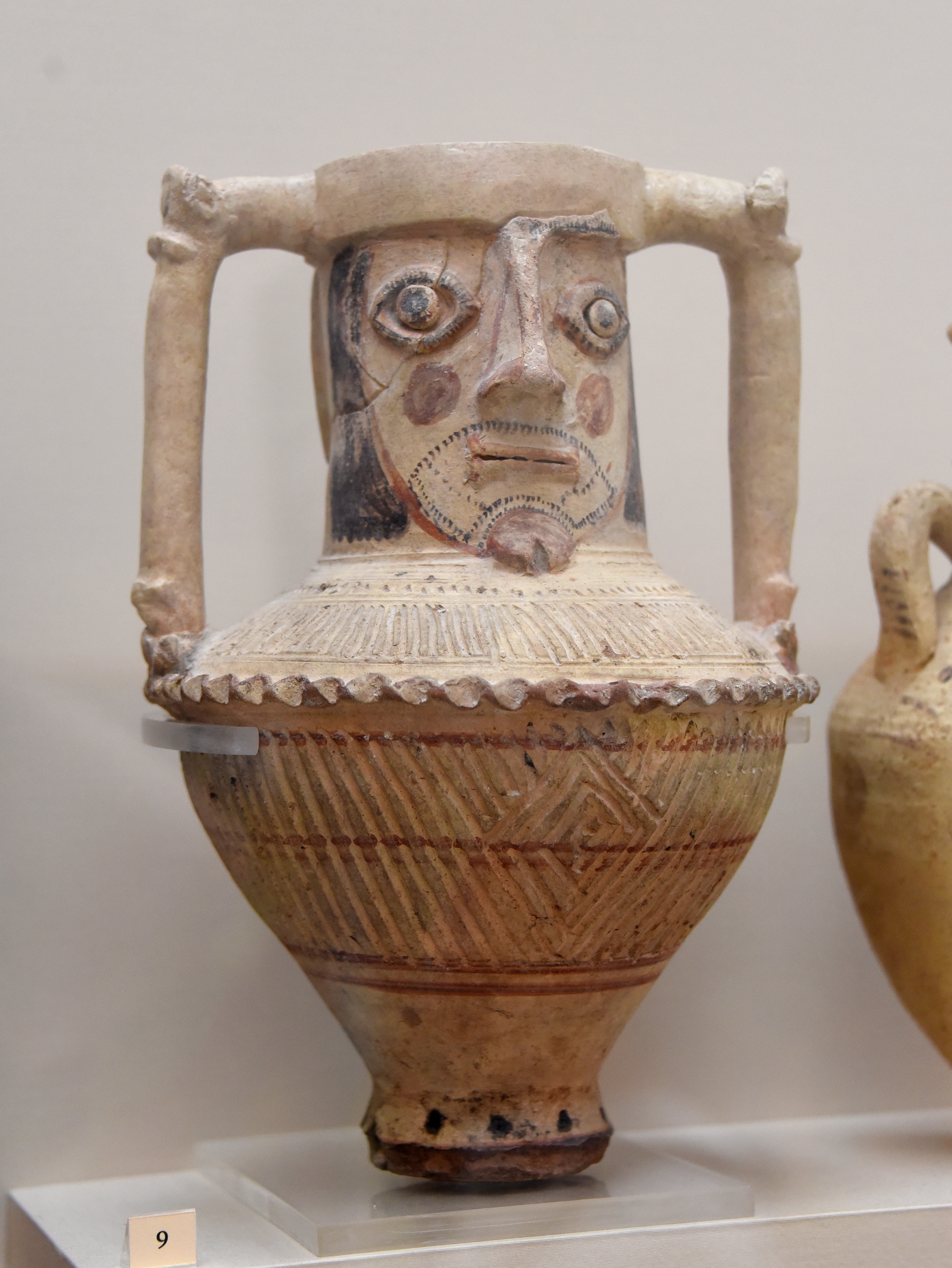 The settlement and monastery at Wadi Sarga were excavated in 1919 by the Byzantine Research Fund. This jug has a large human face on either side, formed from a molded clay, with incised and painted details. Coptic, 5th to 7th centuries CE. From Wadi Sarga, modern-day Asyut, Egypt. (The British Museum, London).