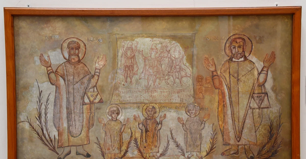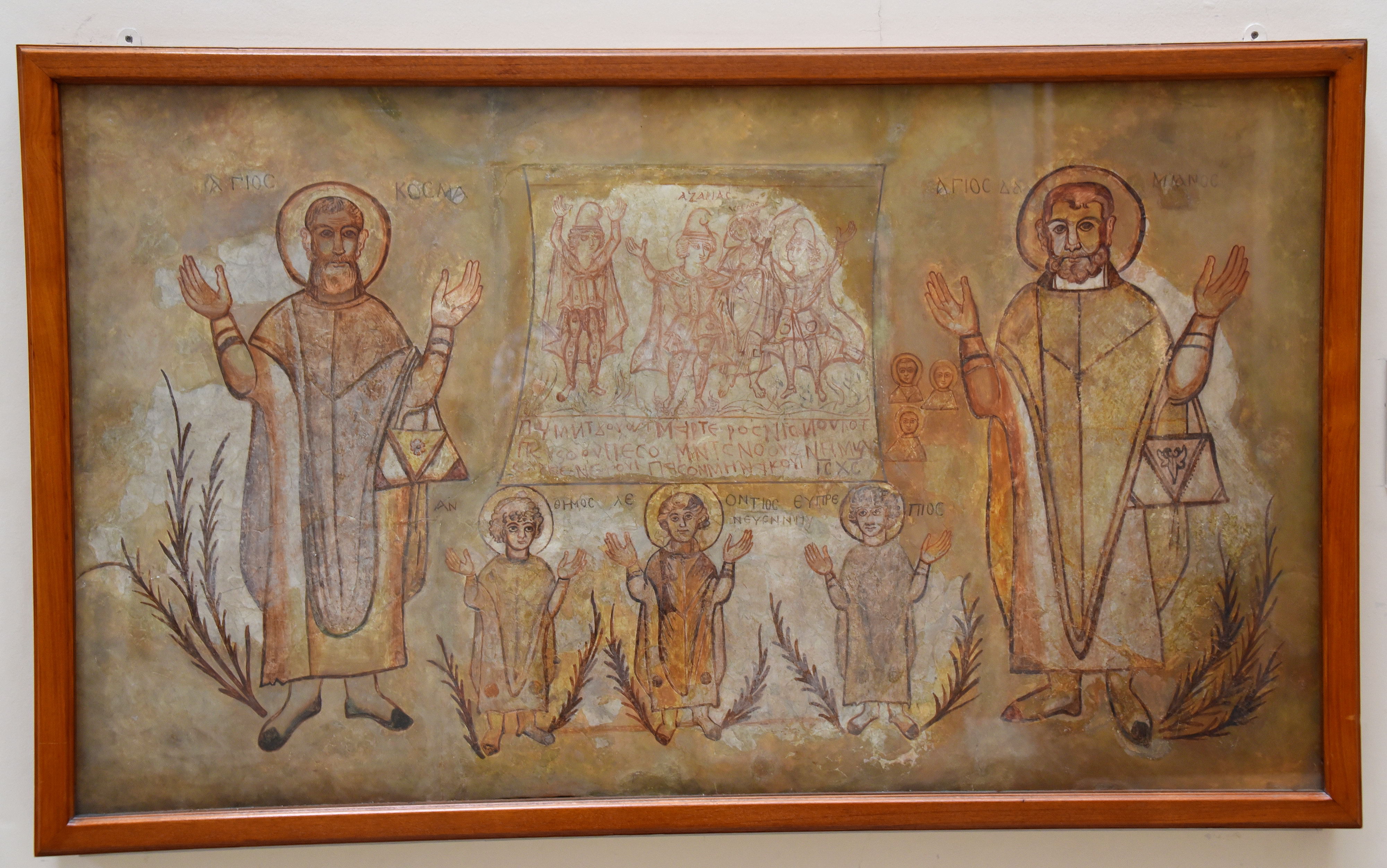 Three separate elements were painted upon the wall of a structure near the monastic complex of Wadi Sarga. The central scene, executed in red outline, depicts the saints Ananias, Azarias, and Misael, known as the "three children in the furnace", being delivered from death by burning by the angel. The text below refers to martyrs from the Egyptian town of Samalut. Large-scale depictions of Saints Damian and Cosmas, accompanied by their brothers Leontios, Eupredios, and Anthinmos were subsequently added to the wall-painting. After surviving torture by burning, here indicated by the palm fronds around their feet, they had been martyred during the persecutions of Diocletian in the late 3rd century CE. Stucco, 6th century CE. From Wadi Sarga, modern-day Asyut, Egypt. Gift of the Byzantine Research Fund(The British Museum, London).
