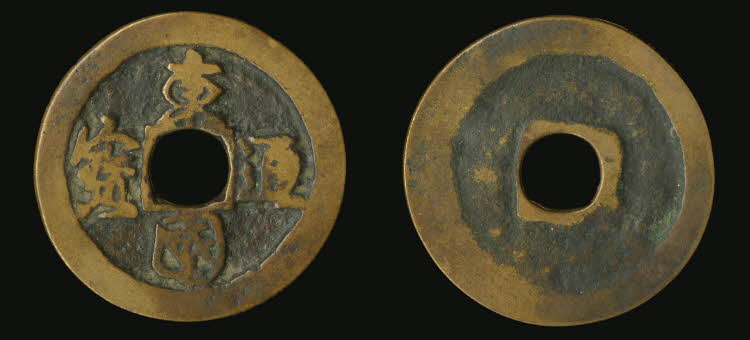 A bronze coin of the Korean Goryeo Dynasty. The legend reads: Tongguk tongbo, meaning 'Coin of the Eastern Kingdom' (Korea). 1097-1105 CE. (British Musem, London)