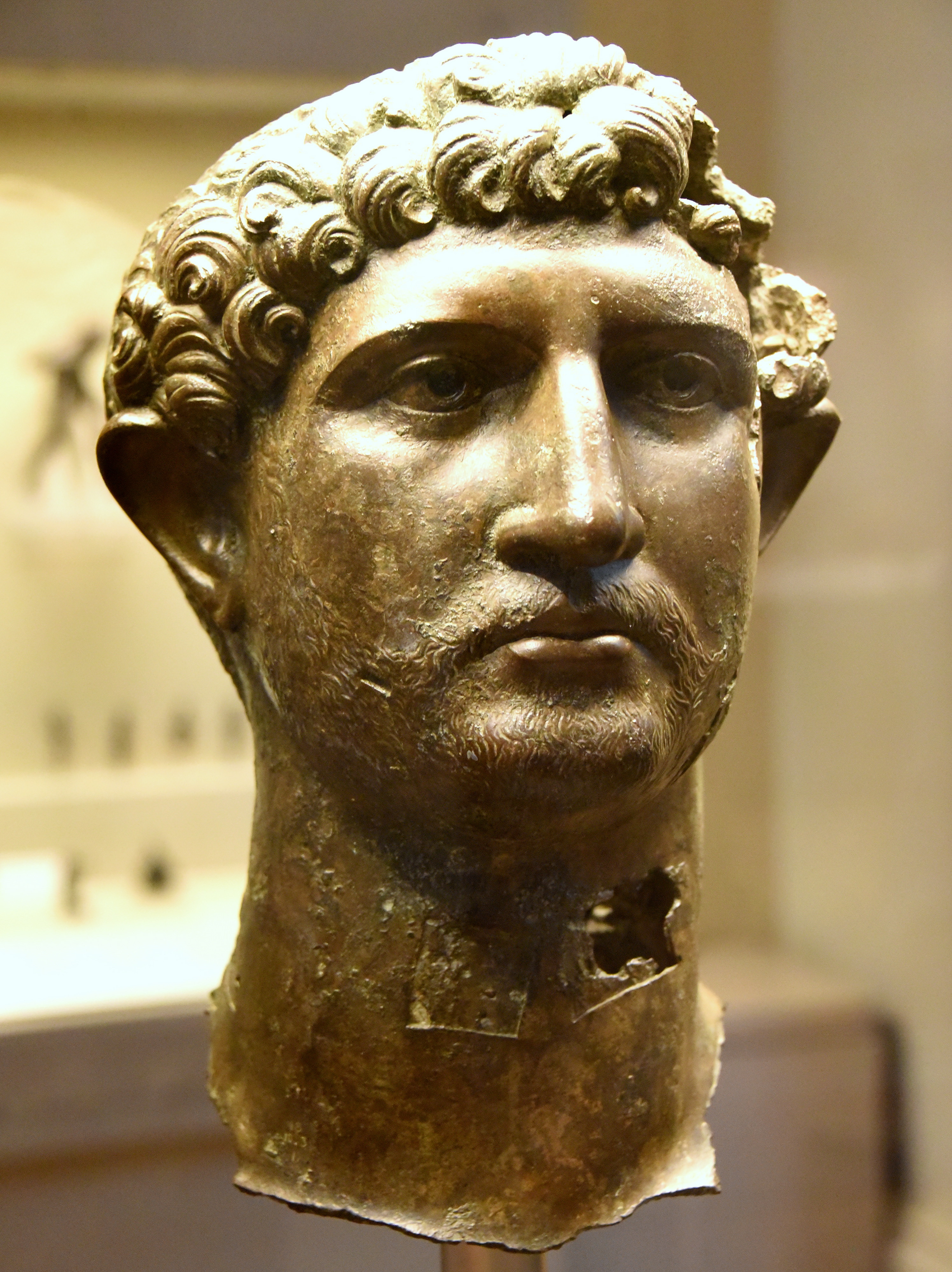 This bronze head comes from a larger than life size statue. The statue probably stood in a public space in Roman London, perhaps in the forum. It may have been put up to commemorate Hadrian's visit to Britain in 122 CE, during which he ordered the construction of a wall to defend the north of the province. Hadrian (reigned 117-138 CE) travelled widely in the Empire, and there are many marble statues of him, but this bronze is a rare survival. 2nd century CE. Found in the River Thames at London Bridge, in 1834 CE. (British Museum, London)