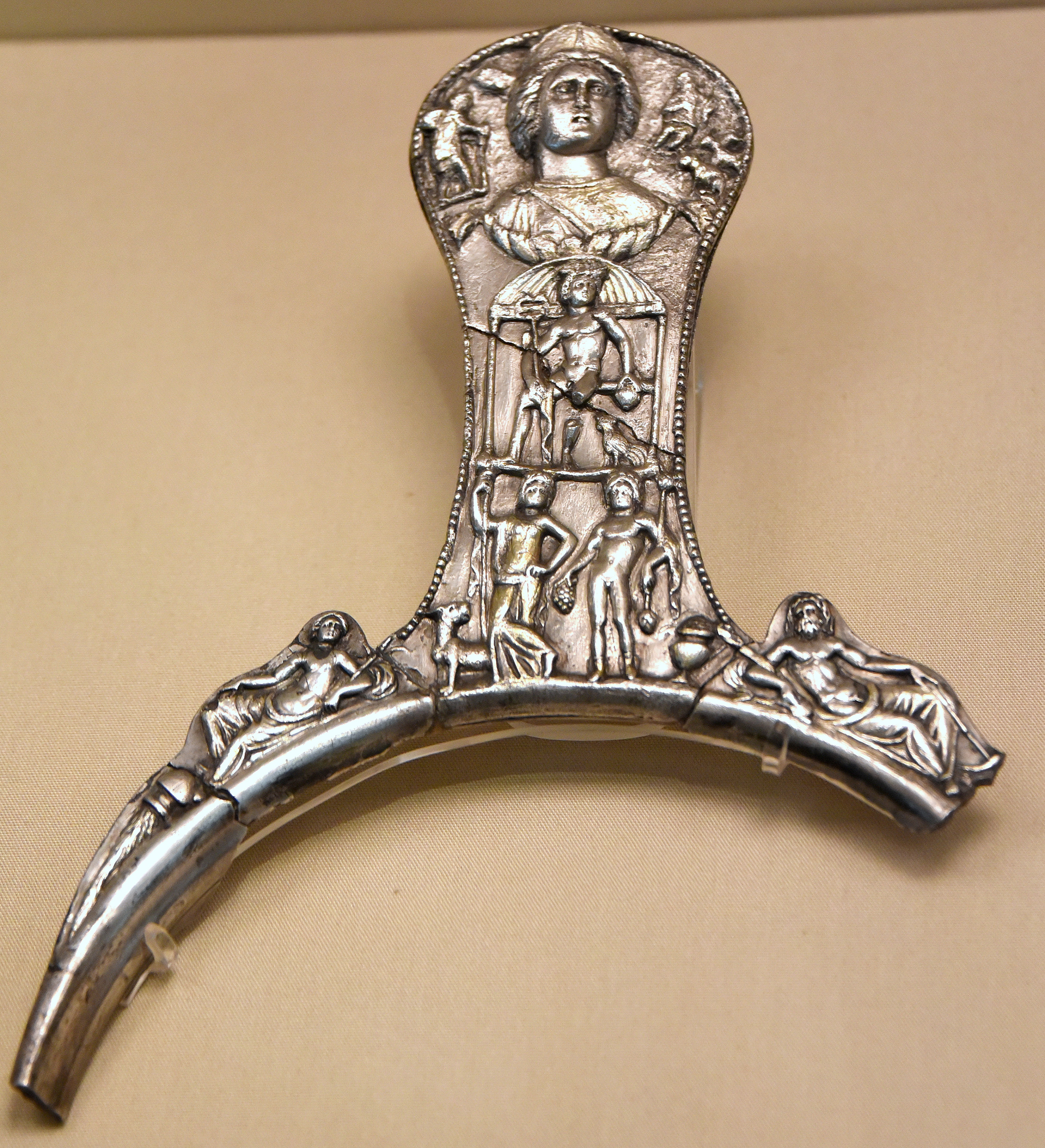 This handle features a bust of Juno, below which is a seated figure of Mercury, and in the lower register, Bucchus and Ariadne. This fragment was part of a silver vessel. Some of these fragments of highly decorated silver vessels, perhaps from a temple treasure, were found in 1747 CE. All the decoration is purely Roman and depicts religious and mythological subjects. 2nd to 3rd centuries CE. From Capheaton, Northumberland, UK. (The British Museum, London).
