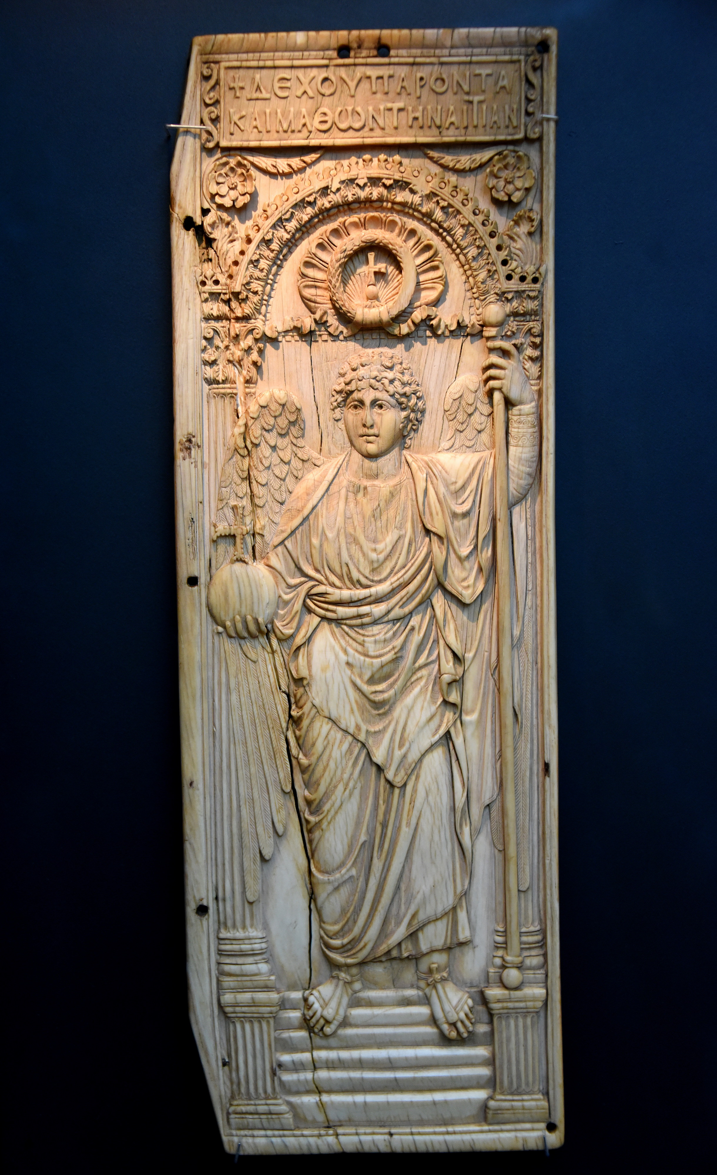 This is one of the largest surviving ivories from the Byzantine Empire. It comes from a hinged 2-leaf diptych, possibly used as a writing table. It shows an archangel holding an orb and sceptre. The style of his drapery is classical, but the Christian subject matter is Byzantine. The ivory's extraordinary size and quality suggest that it was an imperial commission, perhaps by Justinian I (reigned 527-565 CE), a powerful and successful emperor whose patronage stimulated a golden age in Byzantine art. Byzantine, circa 525-550 CE. Made in Constantinople. (The British Museum, London).