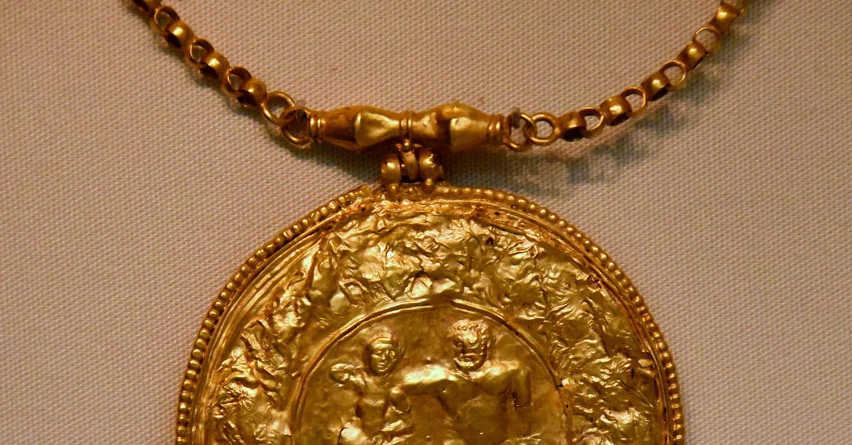 While Christianity was the state religion of the Byzantine Empire, pagan imagery remained popular. Knowledge of classical literature, which often portrayed the lives of pagan gods and heroes, was considered a sign of culture and good education. This embossed gold medallion shows the Greek hero Hercules, which advertised its owner's education. The other face of this medallion shows the pagan goddess Artemis with a bow and arrow. Byzantine, 5th century CE. (The British Museum, London).