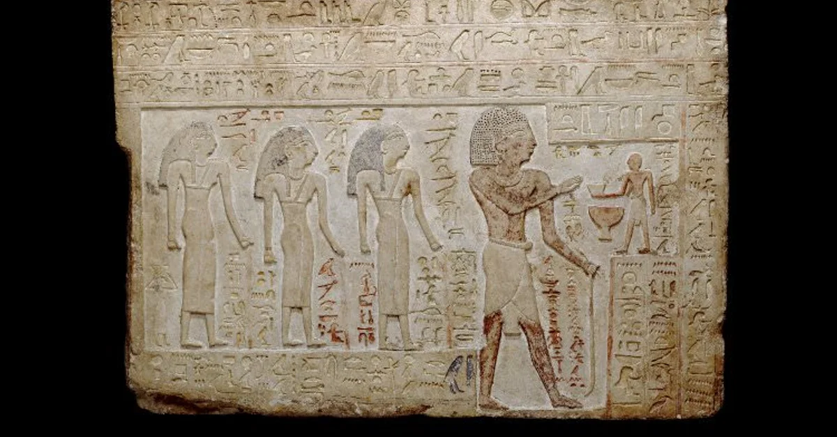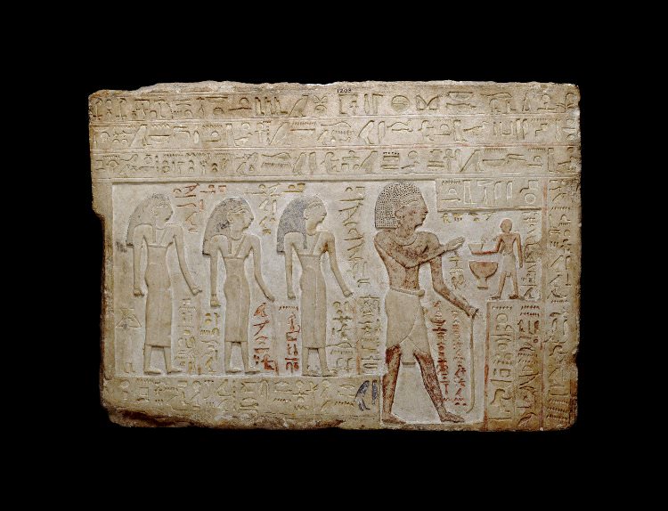 Limestone stela of Intef, son of Ka. Intef is shown standing, receiving an offering from a small male figure who stands in front of him. 11th Dynasty, First Intermediate Period of Egypt.