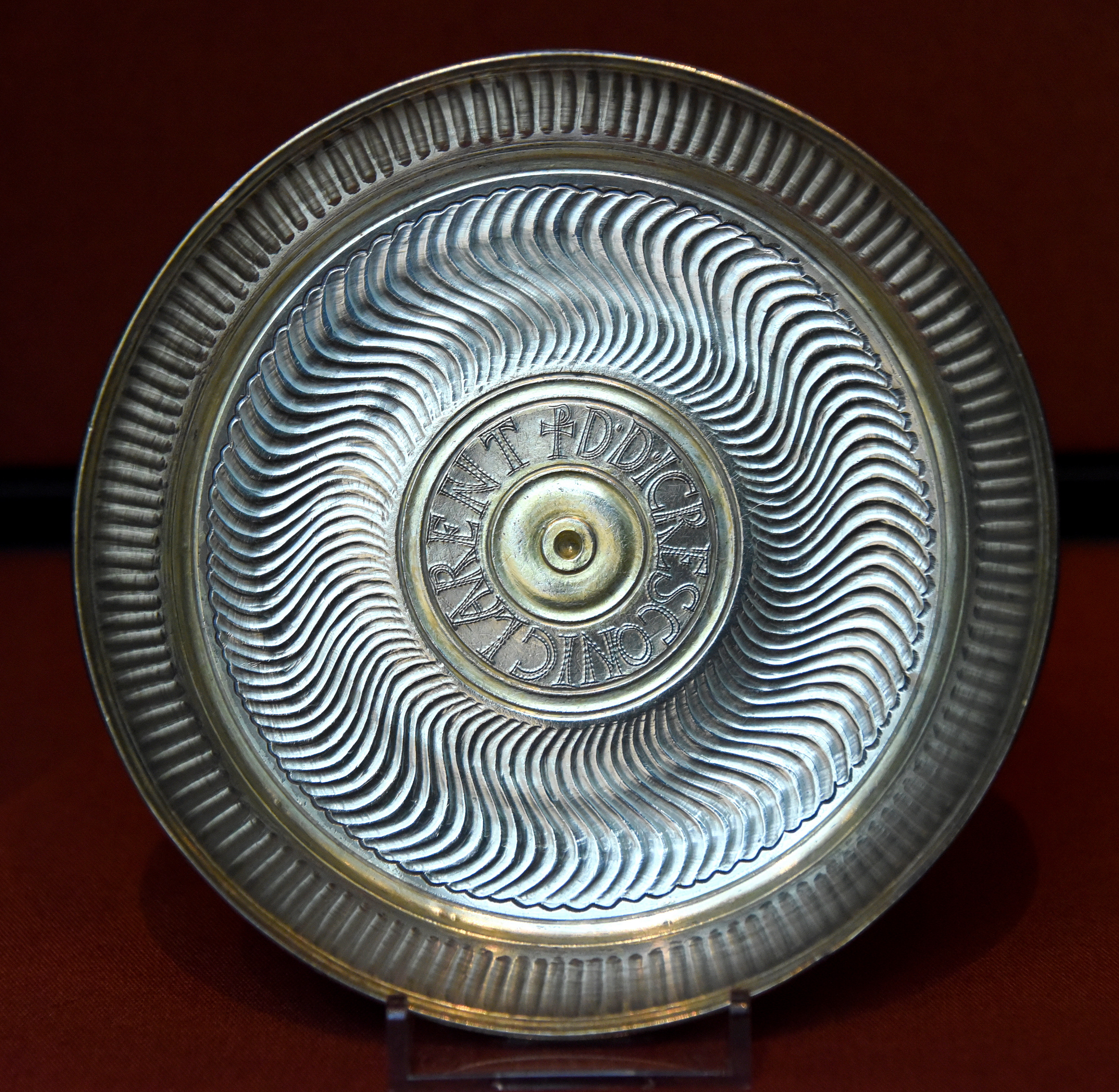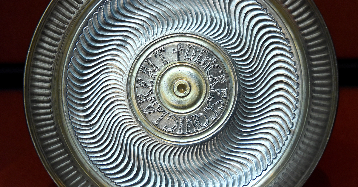 The Latin inscription on this dish, reading D.D.ICRESCONI CLARENT ("Gift given to the distinguished Cresconii"), identifying the family who owned the Carthage Treasure as Cresconii. They were prominent North African family of the 300s to 400s CE, whose members included high-ranking civil servants and members of the clergy. 300s-400s CE. From the Hill of St. Louis, Tunisia. The Carthage Treasure comprises 31 pieces of jewellery and silver tableware, dating from around 400 CE. The treasure was found in Carthage, modern-day Tunisia. It is thought to have been buried for safekeeping by the prominent Cresconii family at a time of crisis, possibly when the city was attacked by the Germanic Vandal King Gaiseric in 439 CE. Bequeathed by Sir Augustus Wollaston Franks. (The British Museum, London).