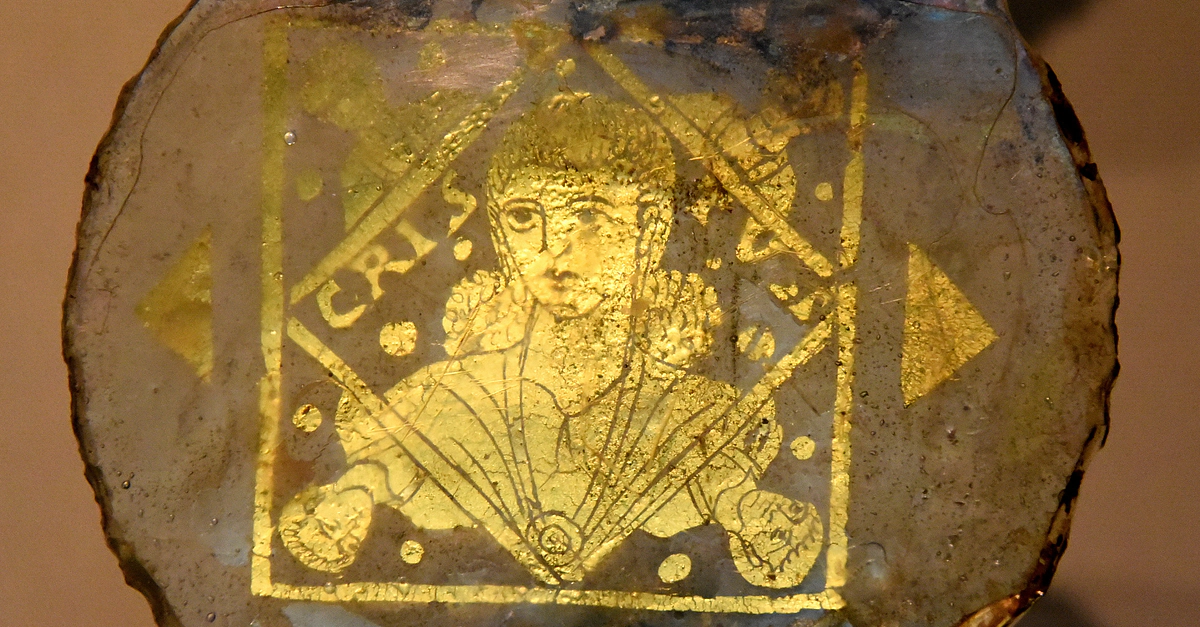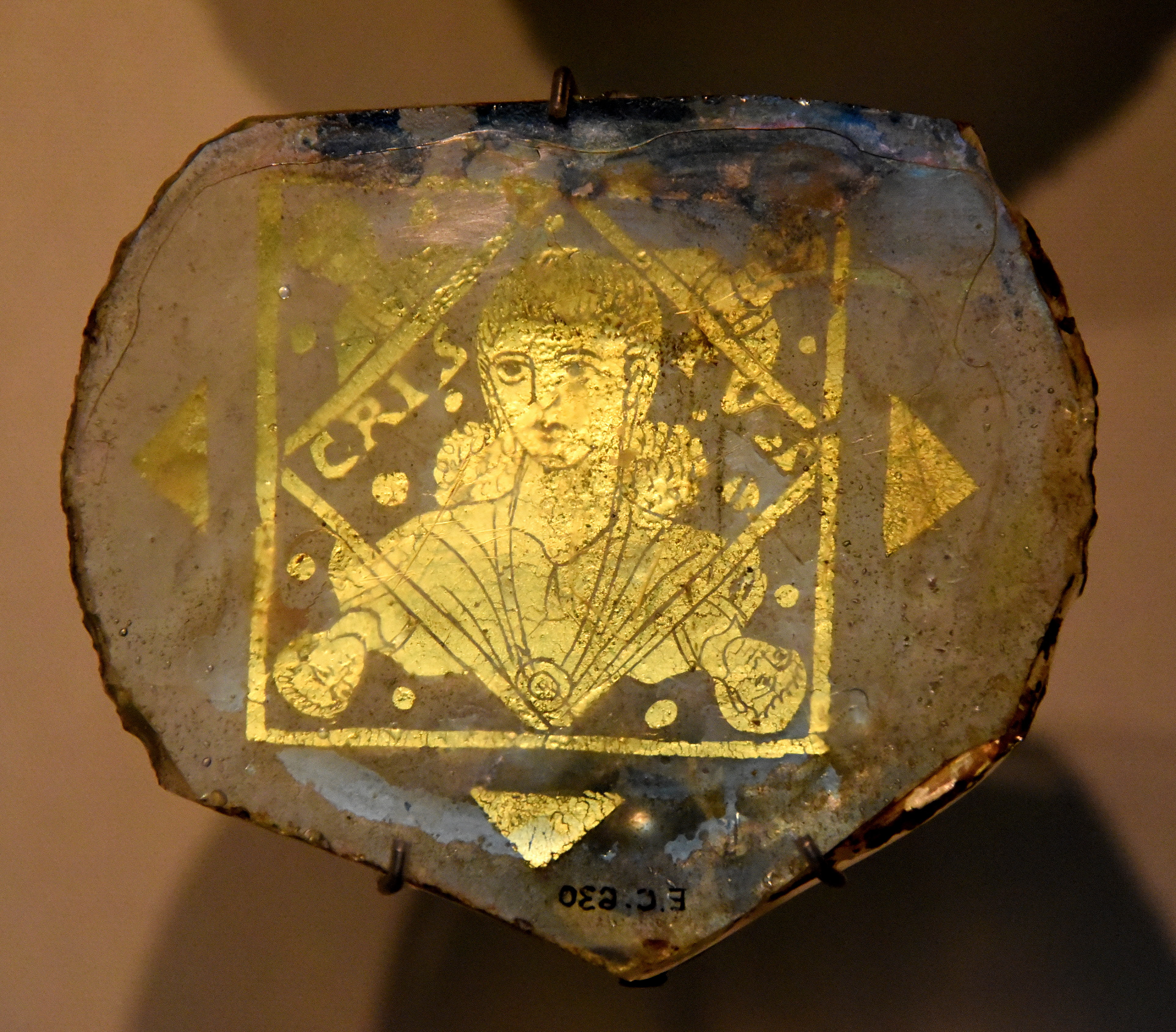 This glass disc came from the base of a drinking vessel, which may have been made as a wedding gift. Many such discs have been found in the catacombs of Rome, suggesting that when one of a married couple died, the vessel's decorative base was cut out and placed over the grave as a memorial. This glass depicts a bust of Christ within a square and then a lozenge. He wears a tunic and mantle fastened with a circular brooch. There is an inscription with five dots on both sides of the head. 4th century CE. From Rome, Lazio, Italy. (The British Museum).